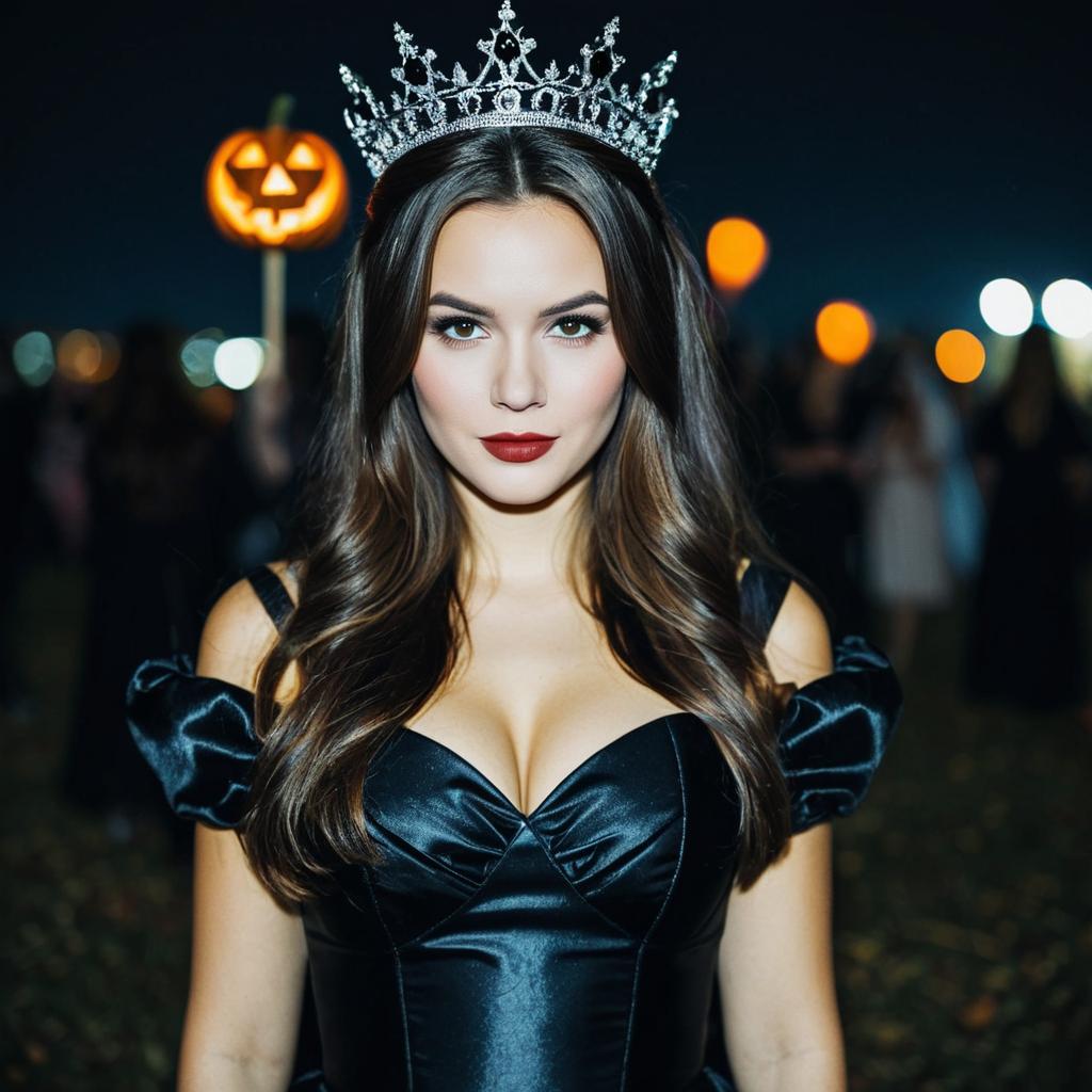Disney halloween dress,1girl, solo, dress, long hair, earrings, jack-o'-lantern, brown hair, jewelry, looking at viewer, pumpkin, blurry, blurry background, outdoors, halloween, puffy sleeves, short sleeves, brown eyes, puffy short sleeves, orange dress