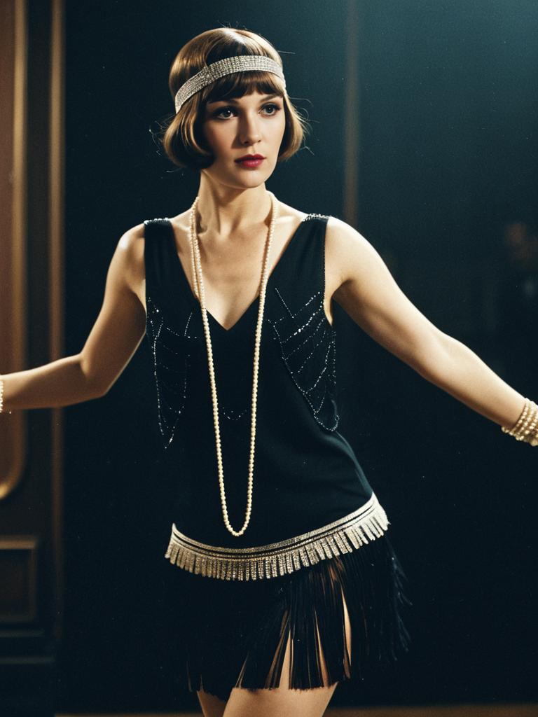Woman in Flapper Dance costume, cinematic realism, dramatic portrait