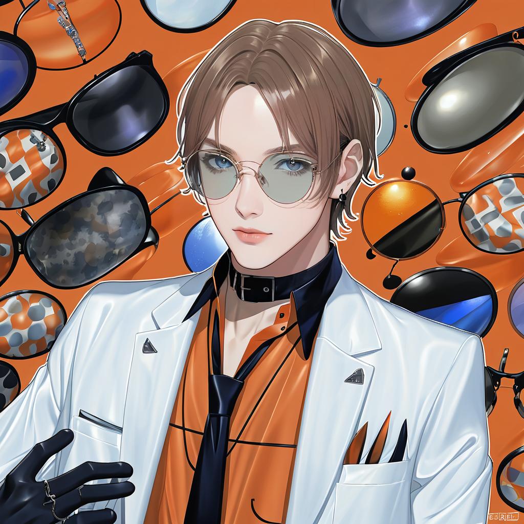 Digital anime-style illustration of a young, androgynous person with short, brown hair and blue eyes, wearing round, silver-framed glasses. They have a fair complexion and are dressed in a white lab coat over an orange shirt with a black collar and a black tie. Black gloves cover their hands, and a folded orange handkerchief is in the left breast pocket. The background is vibrant orange with scattered, oversized sunglasses in various colors and patterns, including orange with white checks and blue with black checks. The overall style is sharp and vibrant, with a modern, fashionable aesthetic.