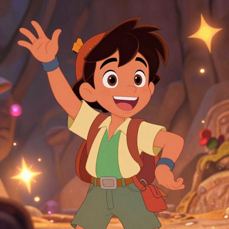 Animated boy with brown hair, yellow shirt, green vest, and brown backpack, waving cheerfully in a magical, starlit cave.