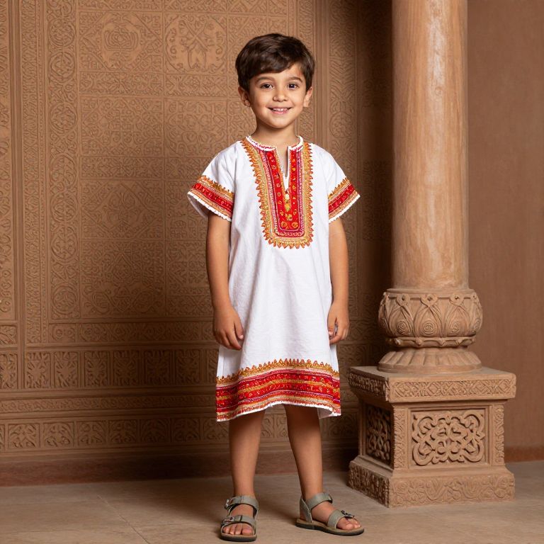 A young boy with short brown hair, wearing a bright white dress adorned with a vibrant red and gold pattern, and paired with comfortable sandals, stands confidently in front of a textured wall featuring an intricate, patterned design. Behind him, a tall, ornate pillar with a decorative base and detailed carvings adds depth and structure to the scene. The lighting is soft and warm, highlighting the boy's joyful expression and the rich details of the clothing and surroundings, creating a whimsical and colorful atmosphere.