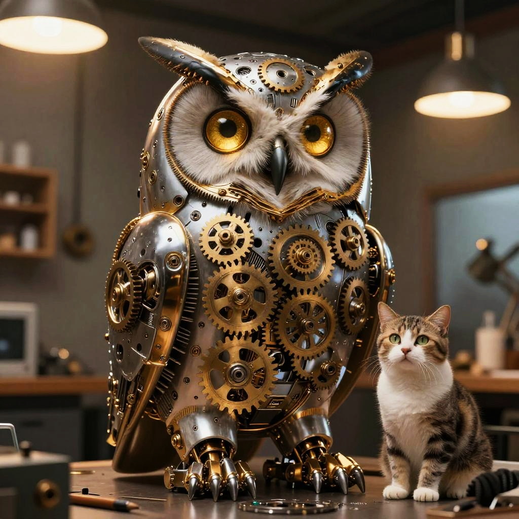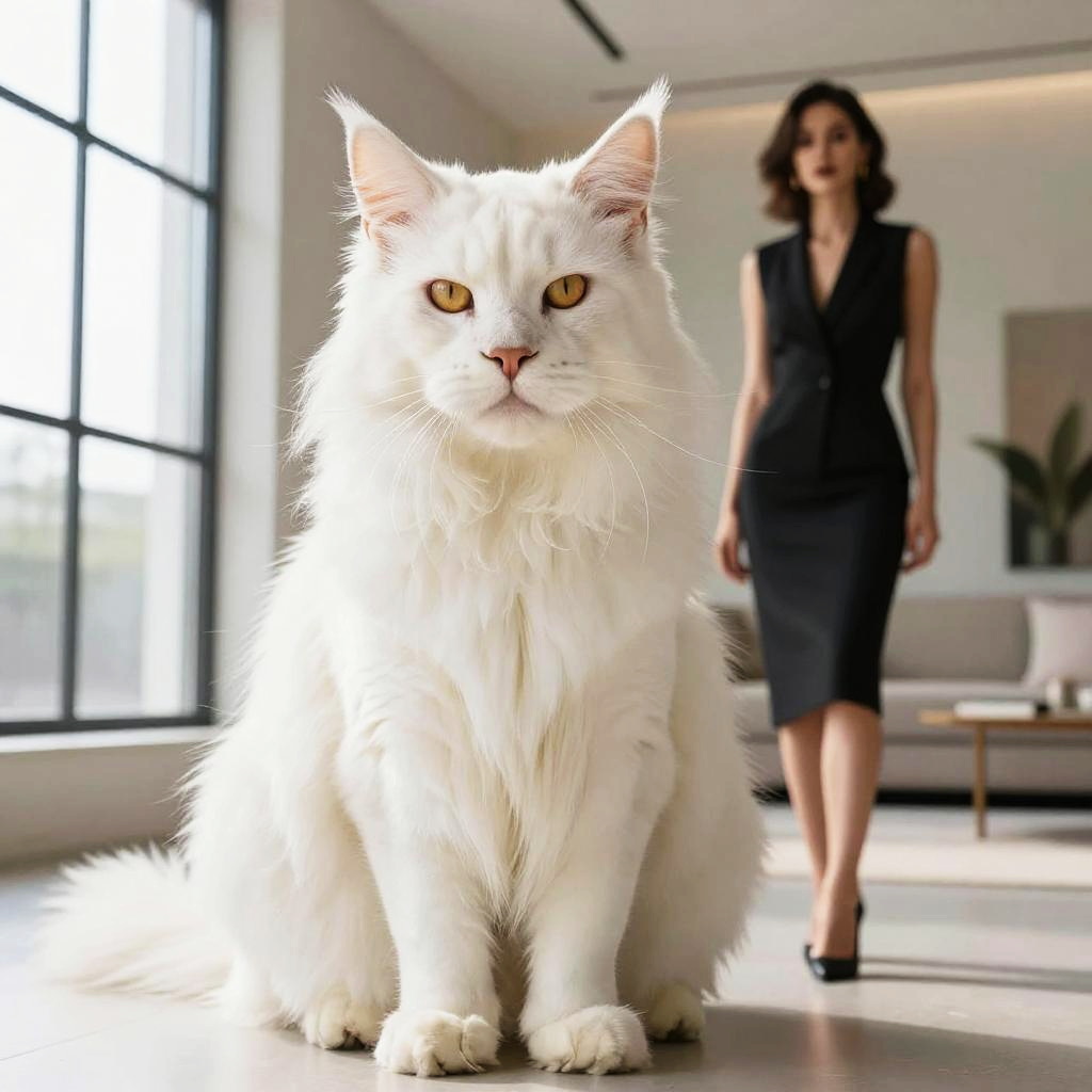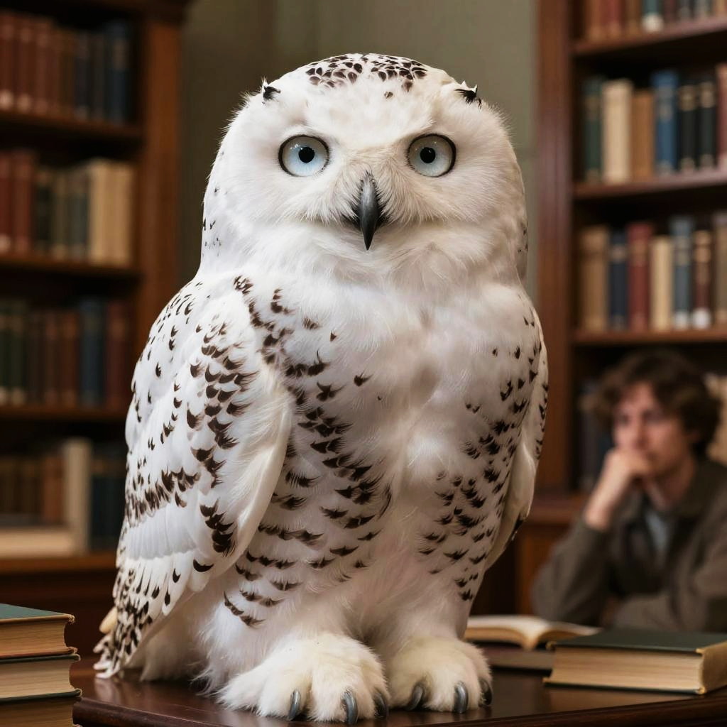 A surreal and captivating scene featuring a gigantic, majestic snow owl sitting indoors beside a thoughtful, scholarly librarian. The cat’s fur is fluffy, soft, and immaculate, with its piercing icy white eyes gazing directly at the viewer. The classic, warmly lit reading room with tall shelves allows soft, natural light to highlight the textures. The overall mood is quiet yet enchanting, blending realism with a subtle touch of fantasy.
