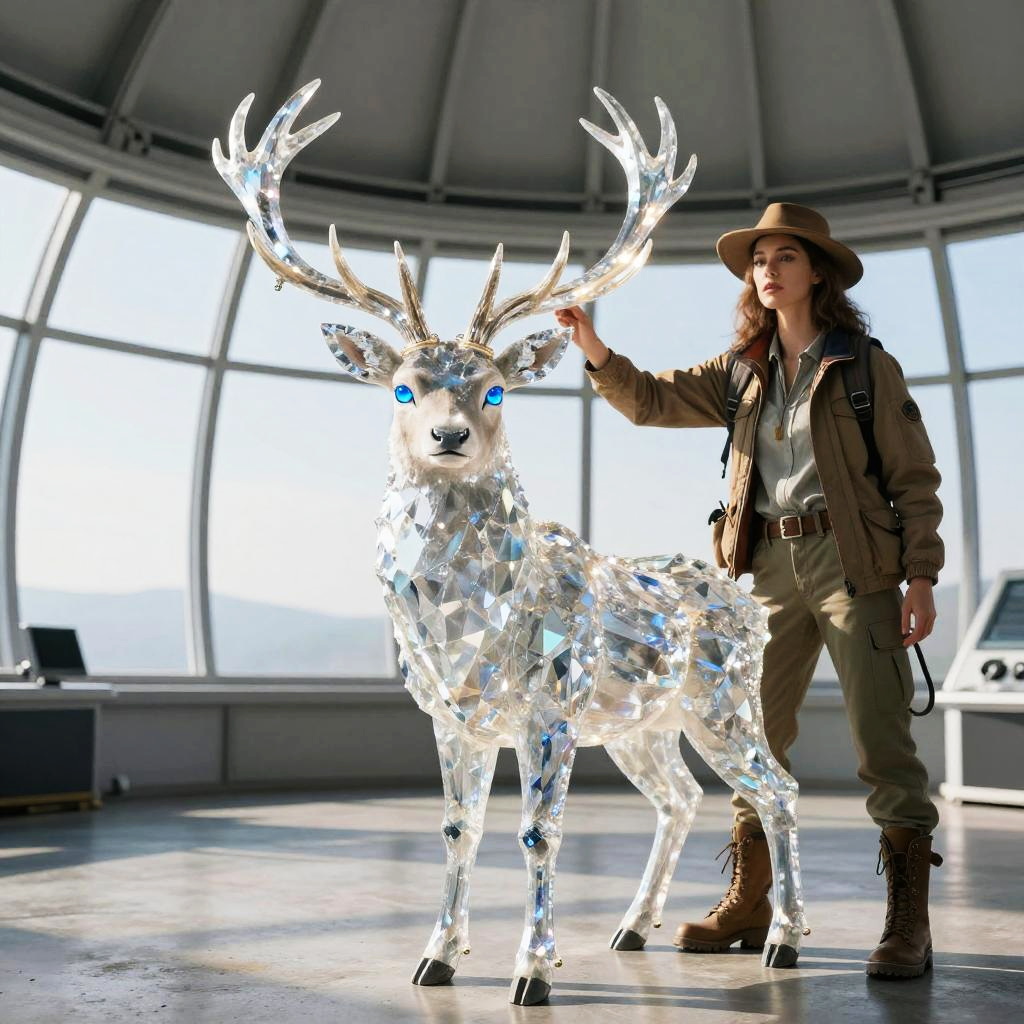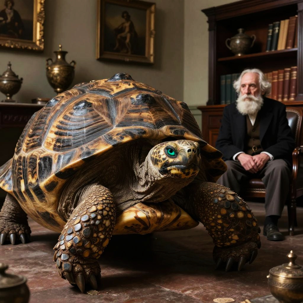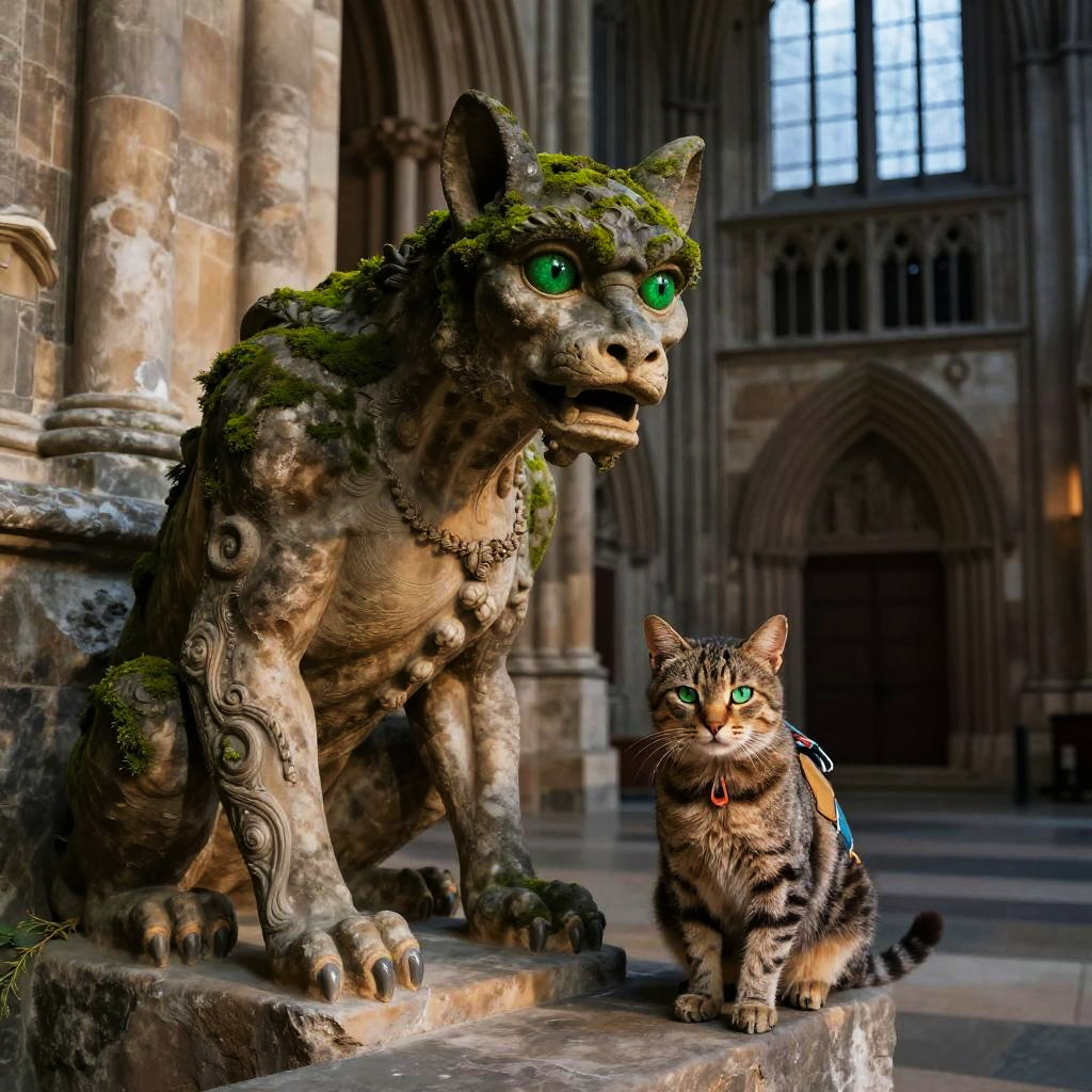 A surreal and captivating scene featuring a gigantic, majestic snow owl sitting indoors beside a thoughtful, scholarly librarian. The cat’s fur is fluffy, soft, and immaculate, with its piercing icy white eyes gazing directly at the viewer. The classic, warmly lit reading room with tall shelves allows soft, natural light to highlight the textures. The overall mood is quiet yet enchanting, blending realism with a subtle touch of fantasy.