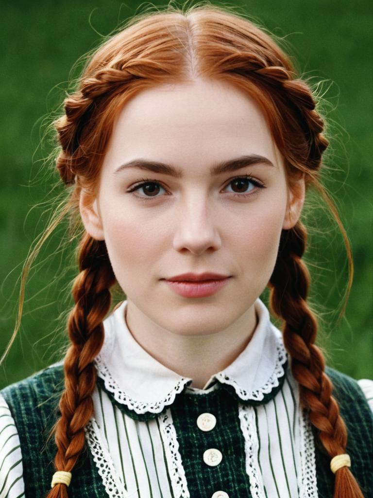 Woman in Anne of Green Gables Costume, close-up detailed headshot with braids