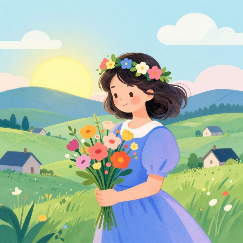 Prompt for kids girl: A friendly girl in a blue skirt and white T-shirt drawing a castle on a picnic blanket, with a kite floating in the breeze and a picnic basket full of fruit, warm pastel colors and soft daylight.