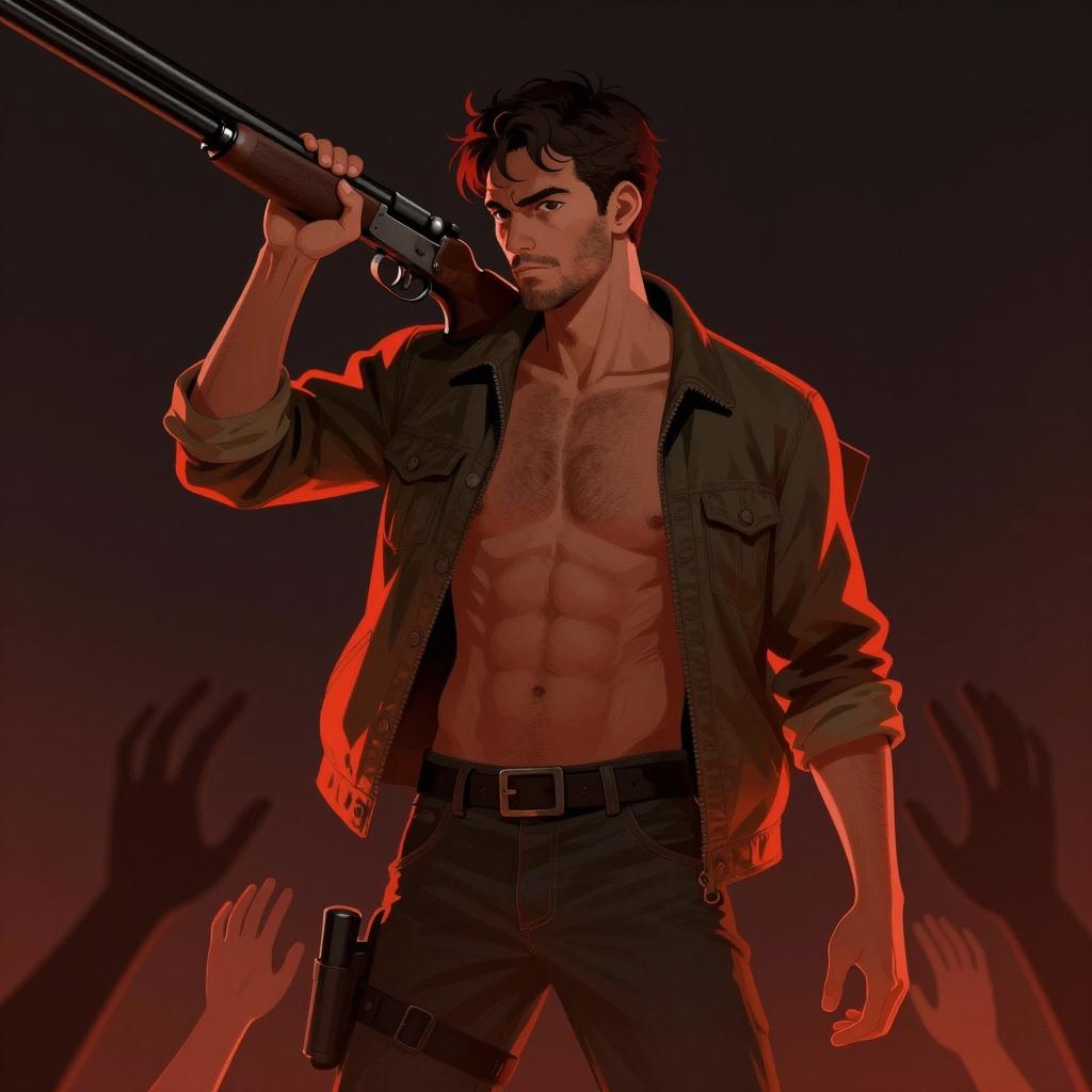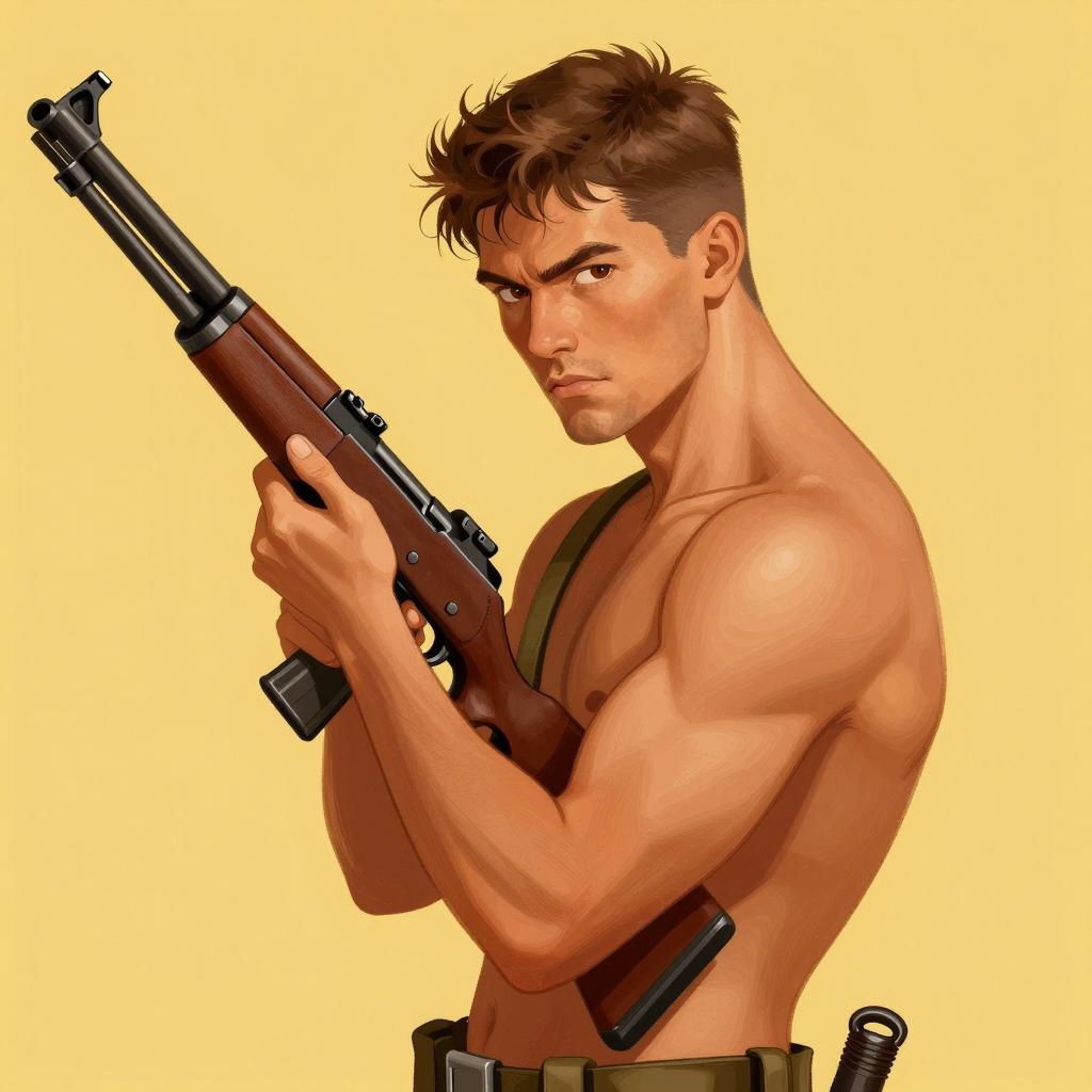 Realistic illustration of a muscular, shirtless man with short brown hair and tan skin holding a rifle. The man has a determined expression and grips the rifle with both hands, positioned against a solid yellow background. The image highlights strong light and shadow effects, emphasizing his muscular build.