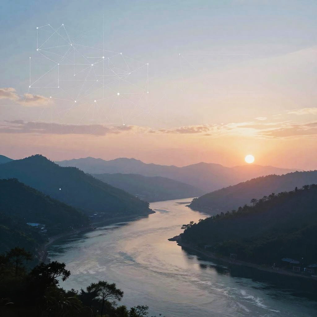 Photograph of a serene river valley at sunset, with silhouetted hills, a reflective river, and a pastel sky. Constellation lines