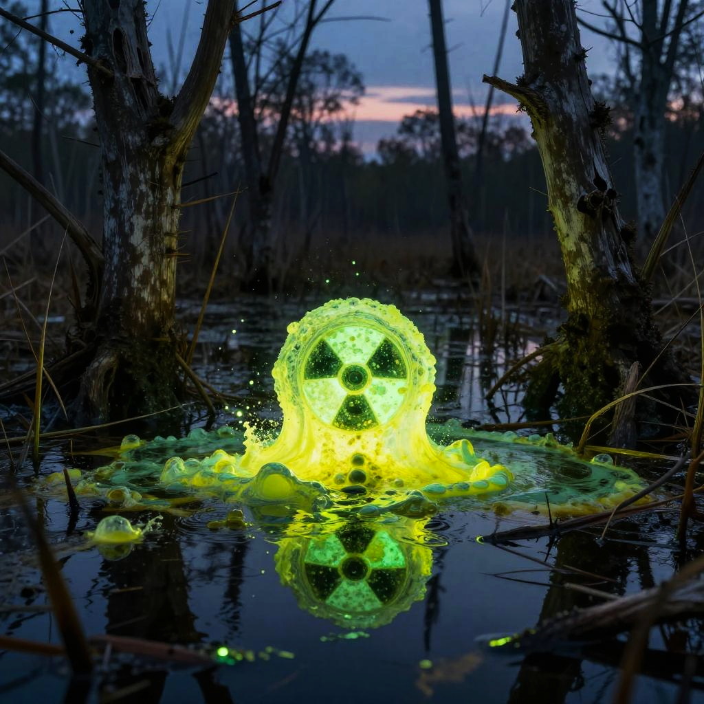 Radioactive goo oozing in a mysterious swamp at dusk, vibrant luminous green and yellow colors contrast with murky water and twisted dead trees, glowing particles floating around, surreal and immersive environment, photorealistic style.