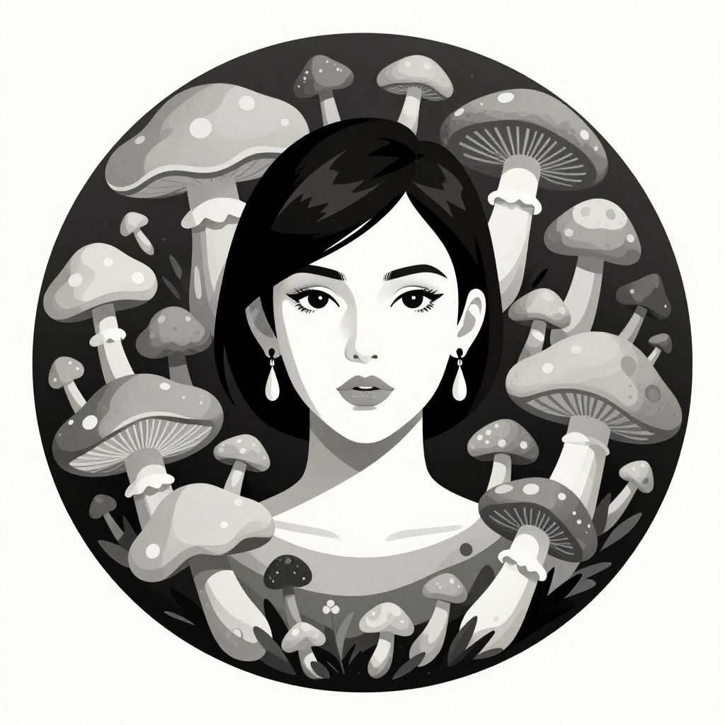 Circular composition featuring a stylized portrait of a woman with short hair and earrings, surrounded by a dense array of mushroom-like forms, rendered in monochromatic tones against a minimalist background.