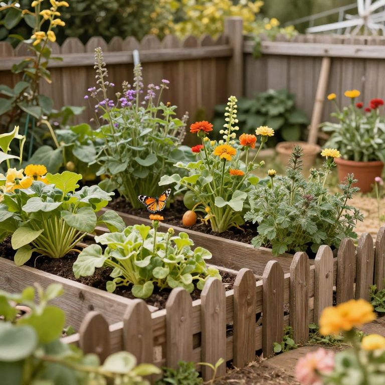Anbau greenhouse full of vibrant vegetables and flowers, glass panels reflecting morning sunlight, modern hydroponic systems visible, surrounded by a neat garden with bees and butterflies, bright and lively environment, detailed botanical illustration style