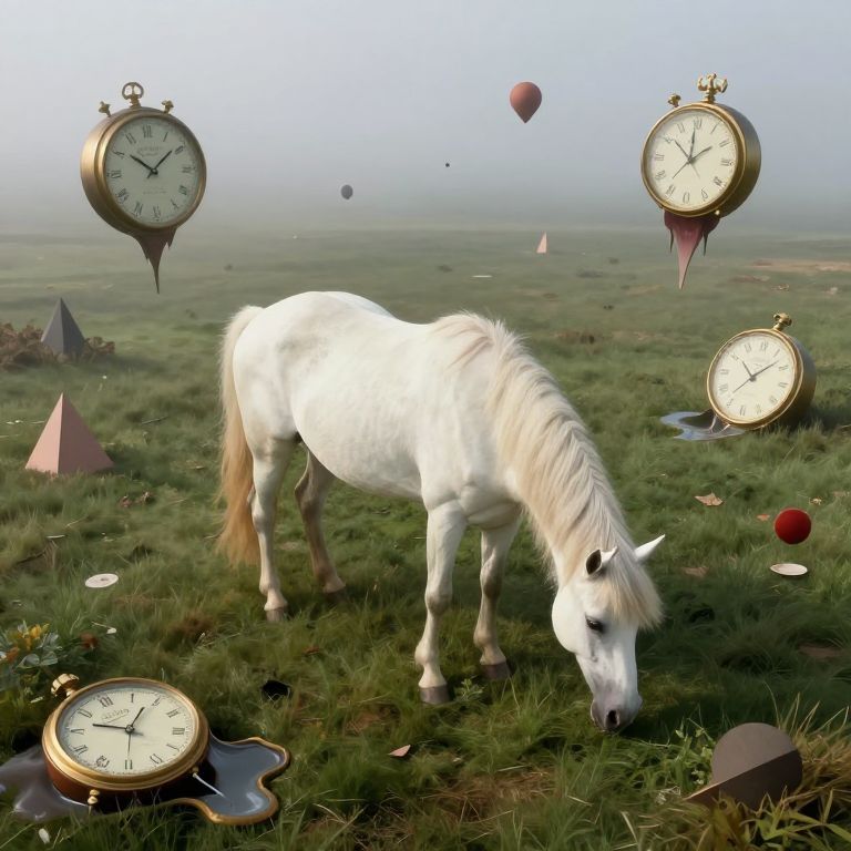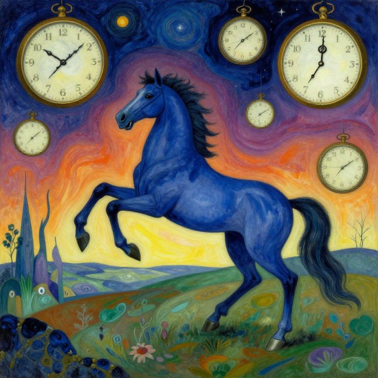 Craft an image embodying the enchanting dreamlike essence of Marc Chagall and Salvador Dali's distinctive styles, portraying a whimsical scene from a 'bug's-eye view.' In this surreal landscape, a vivid blue horse with elongated limbs gracefully dances amidst floating timepieces suspended in midair. The background seamlessly merges surreal landscapes with celestial bodies, creating an enchanting tapestry that distorts the perception of time. This imaginative masterpiece harmoniously blends both artists' unique styles, captivating viewers with its rich colors, intricate details, and bizarre juxtapositions of elements to evoke feelings of wonder and curiosity.