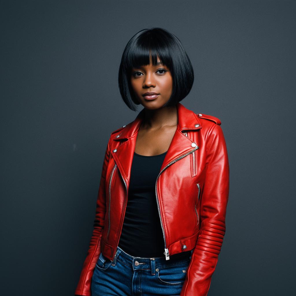 Portrait of a young African American woman wearing a red leather jacket, black tank top, and relaxed-fit blue jeans. She has a sleek bob haircut with bangs and minimal makeup, standing against a solid dark gray background.
