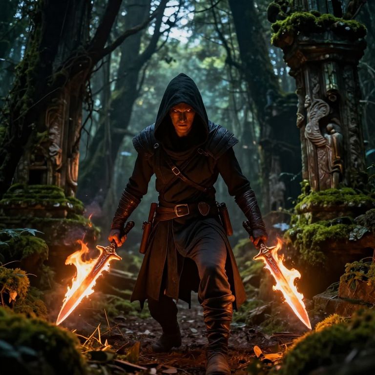 Weilding dual flaming daggers, a stealthy rogue moves through dense enchanted forest shadows, mischievous glowing eyes peering from the dark, flickers of firelight illuminating ancient moss-covered ruins around.