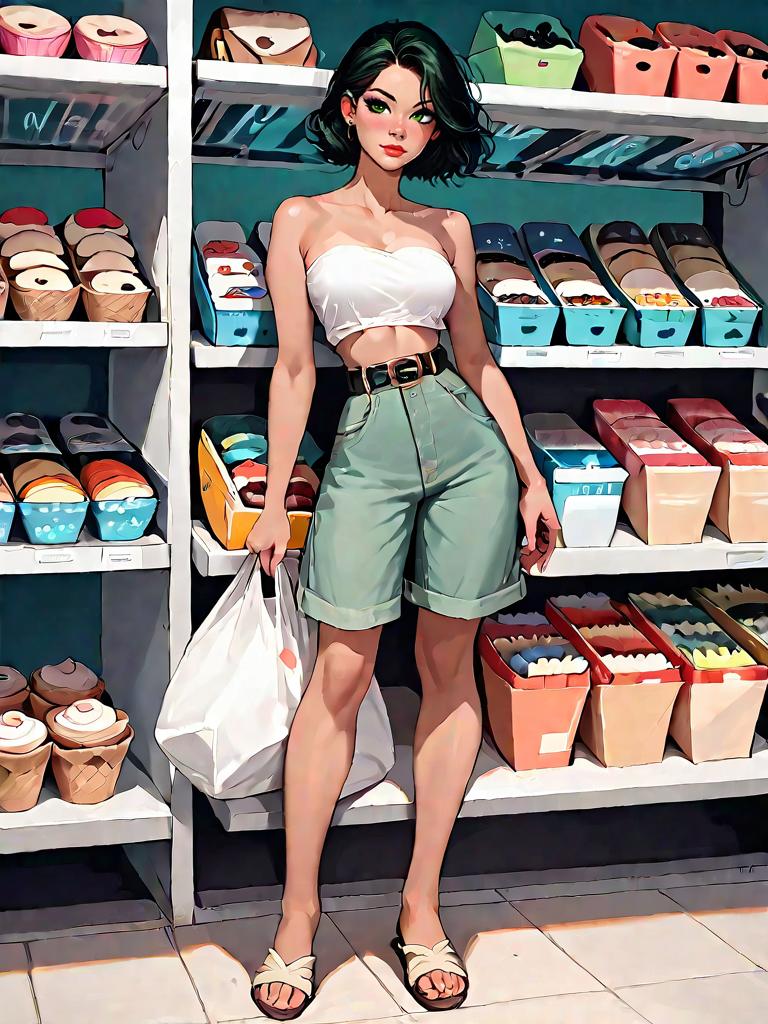 1girl, source_comics, realistic face, full body shot, Woman, casual street style, striped knotted crop top in dark and light striped pattern, plunging neckline, long black denim jacket with pearl embellishments on the sleeves, high-waisted faded black jeans, store interior background.