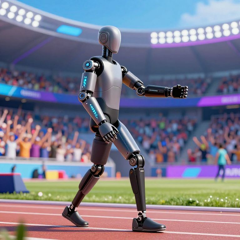 CGI image of a shiny, metallic humanoid robot walking on a track in a brightly lit stadium with cheering crowds.