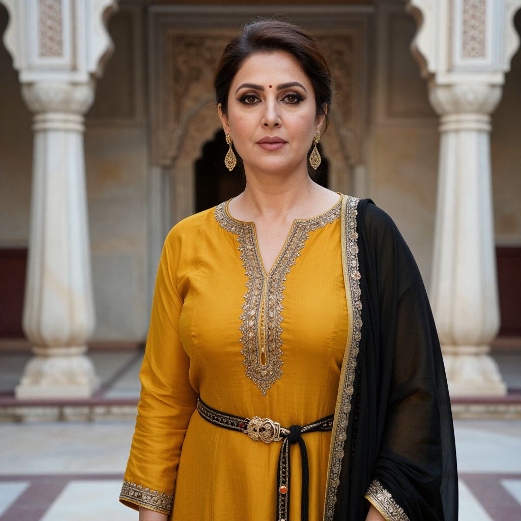 Photograph of a confident Indian woman with dark hair, wearing a mustard-yellow salwar kameez with black sheer dupatta and gold embroidery, standing