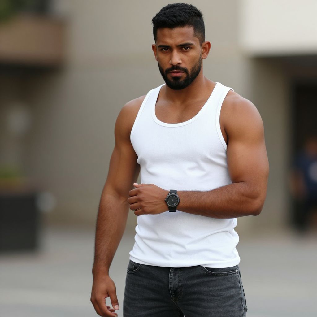 Photograph of a muscular, bearded man with short black hair and medium brown skin standing confidently with arms crossed. He wears a black, sleeveless tunic that reaches mid-thigh, revealing his toned arms and legs, and brown sandals. The background features a blurred, beige-walled interior with a wooden door on the left and a potted plant on the right. The floor is white and glossy, reflecting the soft lighting. The man's serious expression and relaxed stance give a strong, stoic presence.