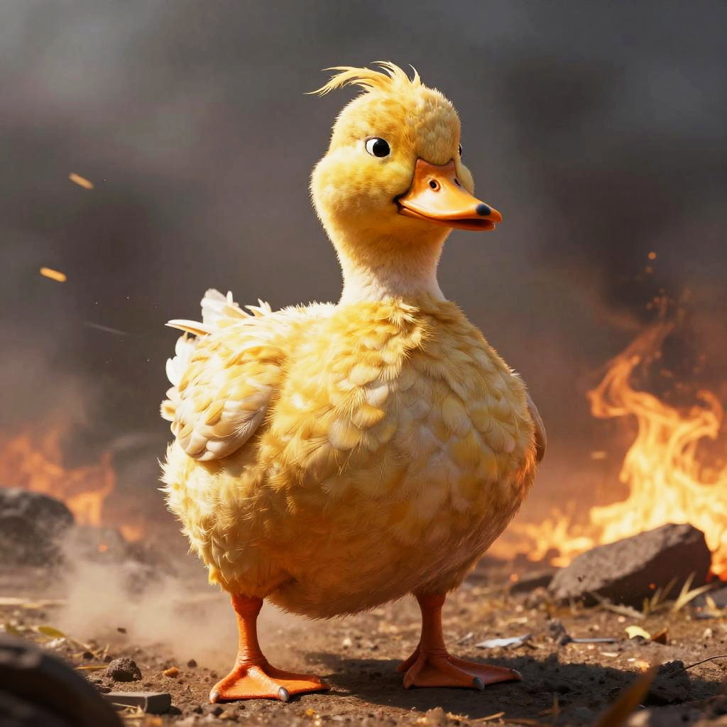 Gigachad duck in a dramatic action pose on a battlefield, feathers ruffled by wind, intense eyes glowing, cinematic smoke and fire backdrop, ultra-detailed muscular body and sharp shadows, epic and heroic composition