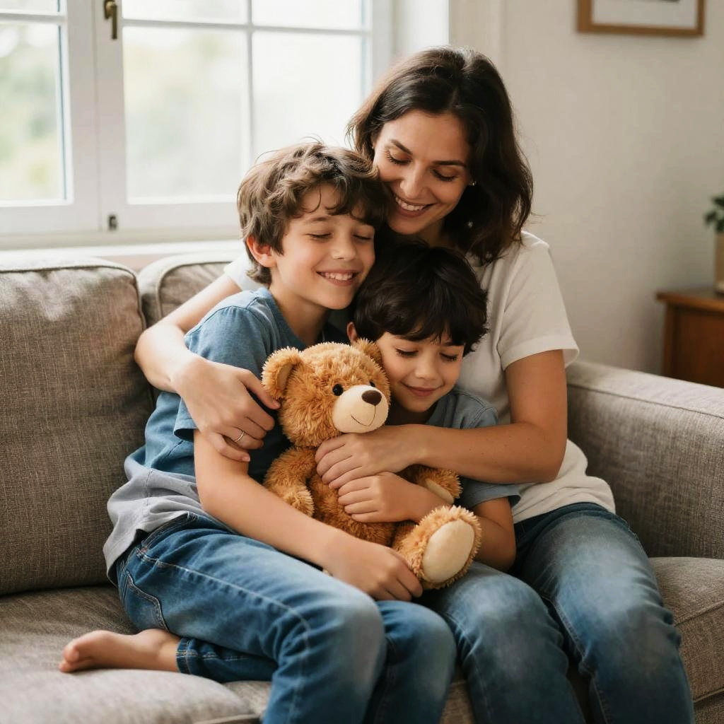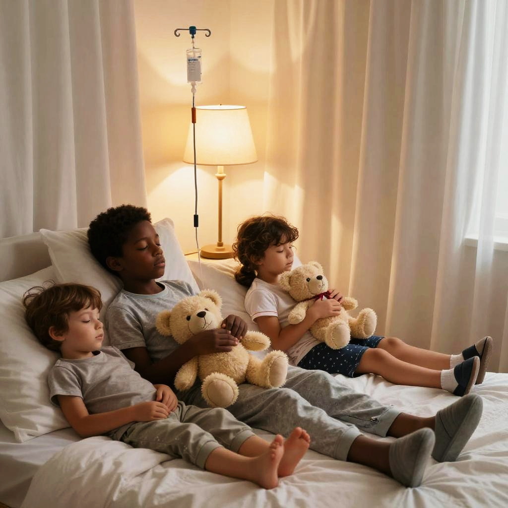 Stuffed toy, curtains, indoors, stuffed animal, pajamas, child, sleeping, dark skin, 1boy, closed eyes, 1girl, intravenous drip, sitting, lamp, dark-skinned male, slippers, multiple boys, 2boys, brown hair, lying, on back, holding, old, teddy bear, shirt