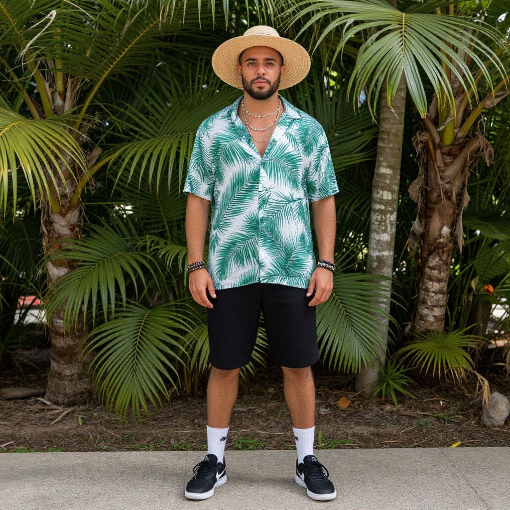 Full body portrait of a man standing outdoors in a tropical setting surrounded by palm trees and plants. He wears a straw hat, a short-sleeve shirt with green palm leaf print, black shorts, white socks, and black sneakers. The man has facial hair and is accessorized with layered necklaces and bracelets.