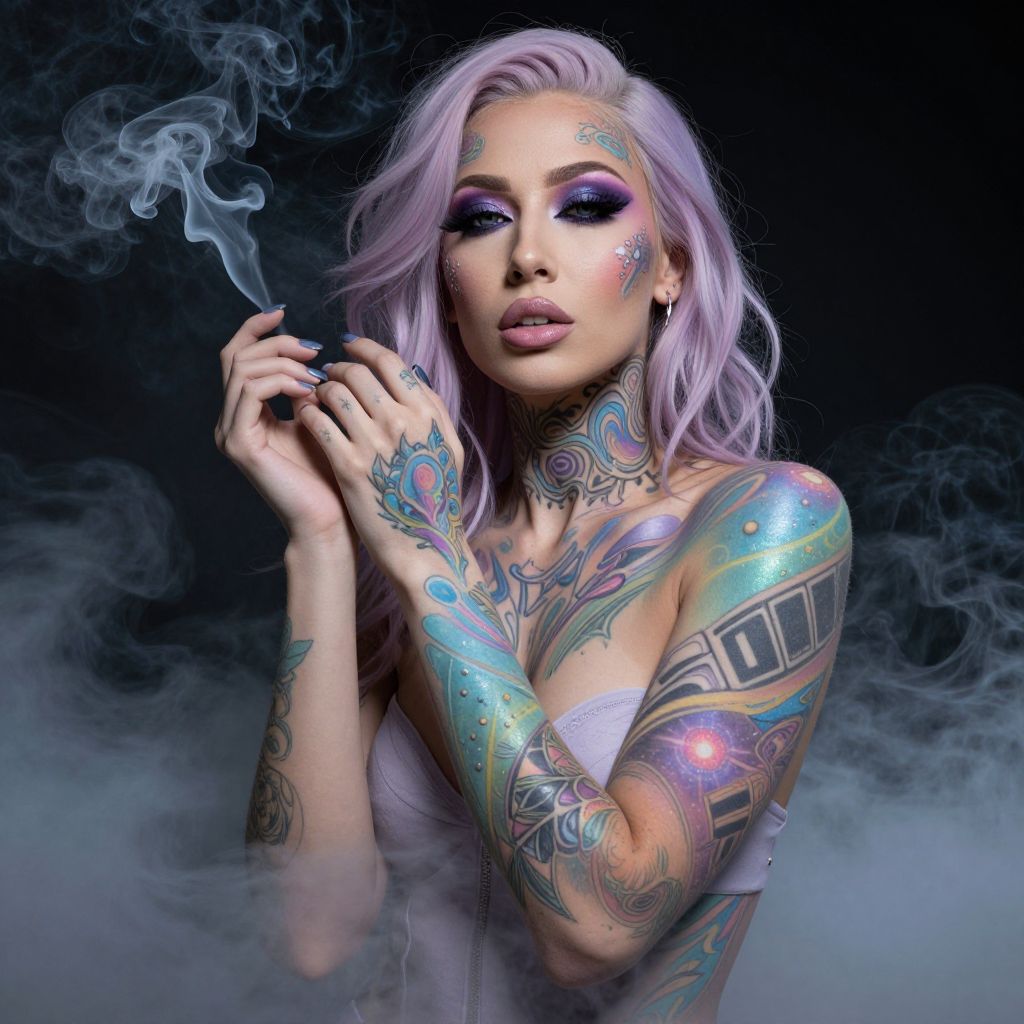 Photograph of a tattooed woman with light purple hair, holding a lit cigarette. She has vibrant, multicolored tattoos covering her arms, chest, and neck. Her makeup is bold, with purple eyeshadow and pink accents on her cheeks and lips. She wears a white, strapless top, partially obscured by swirling blue-gray smoke. Her hands are delicately raised, fingers adorned with rings. The background is dark, making her colorful tattoos and smoky appearance stand out prominently. Her expression is confident and slightly seductive. The overall style is edgy and futuristic.