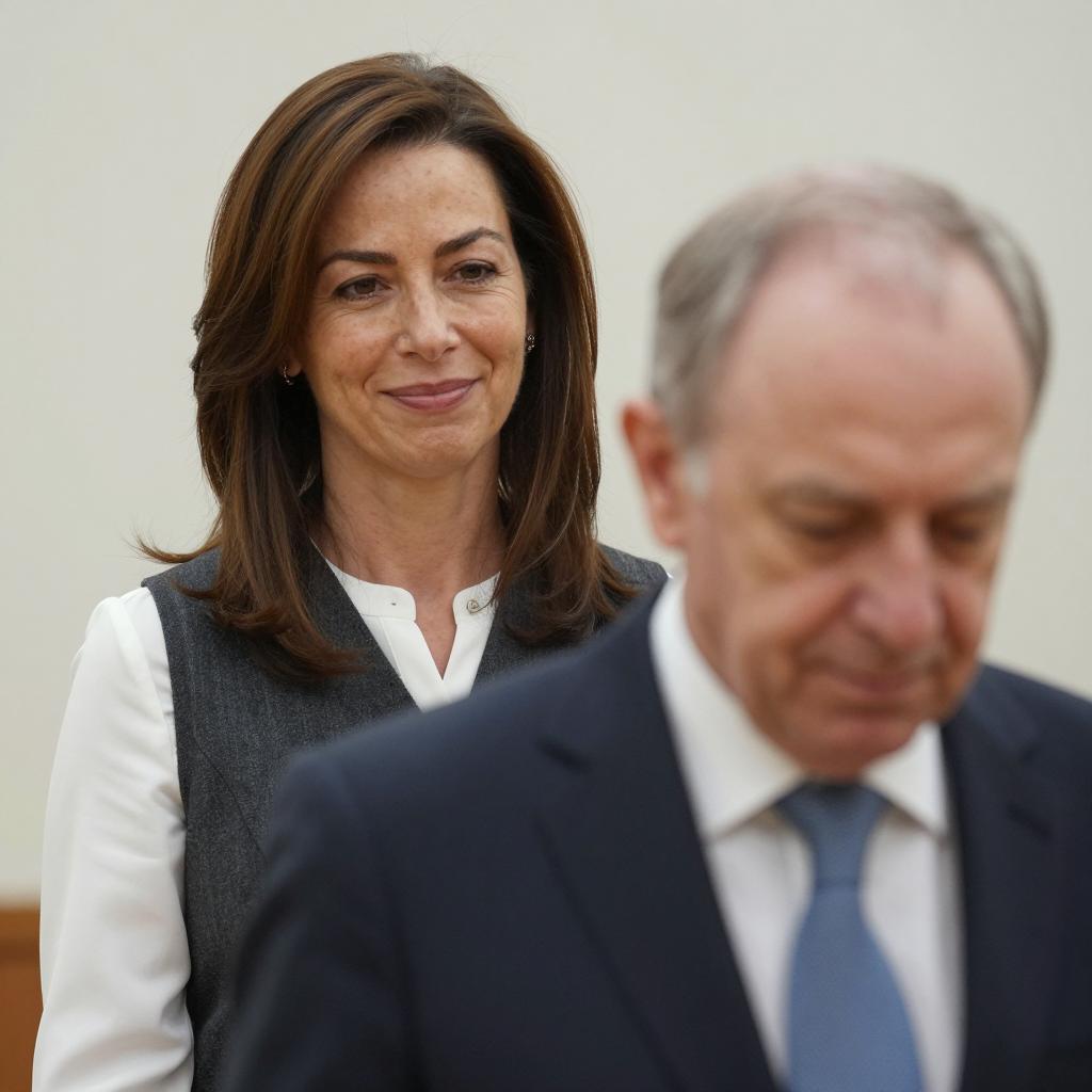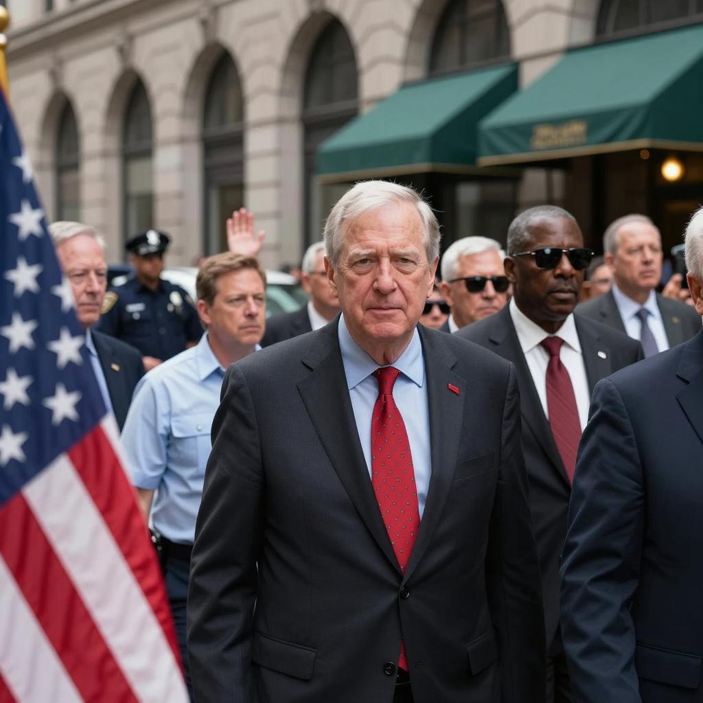 A crowded indoor event. Foreground: white-haired elderly man in suit, looking downward. Center: middle-aged man with gray hair in black shirt, leaning forward, intense expression. Right: woman with long dark hair, sunglasses, blue leather jacket, serious expression. Right foreground: black man with shaved head, dark suit. Background: people, photographers, flags, decorated room. People seated and standing, diverse ages. Bright lighting.