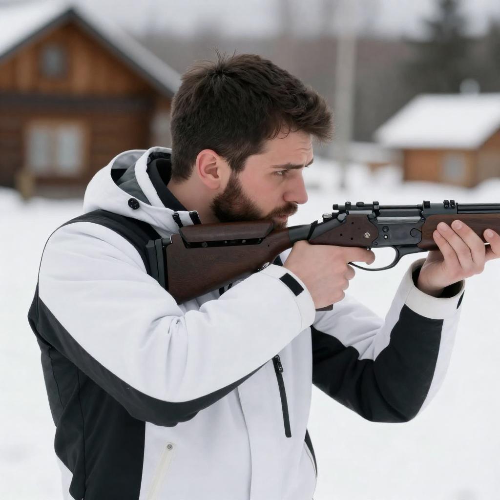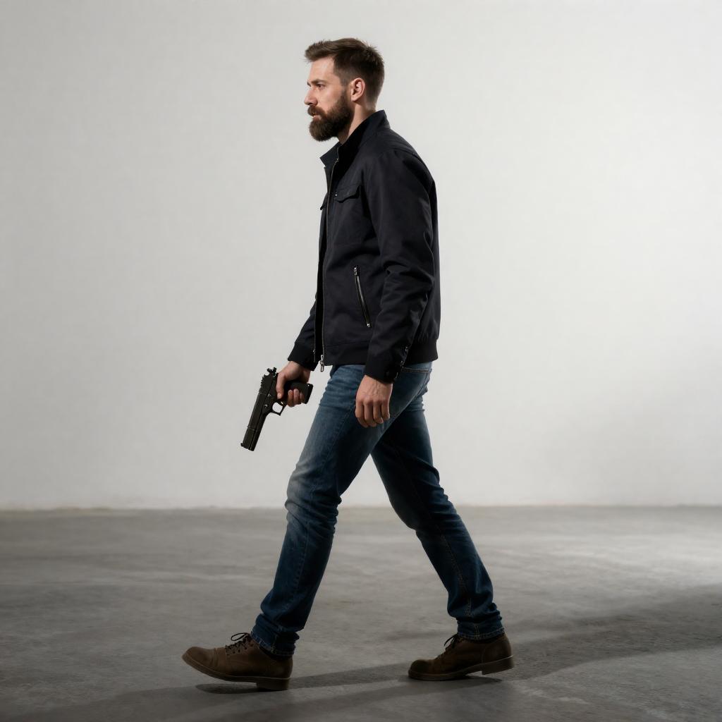 Photograph of a bearded man in a dark jacket and jeans, holding a handgun, walking to the right against a bright, smoky white background. His shadow stretches on the dark ground, creating a dramatic contrast.