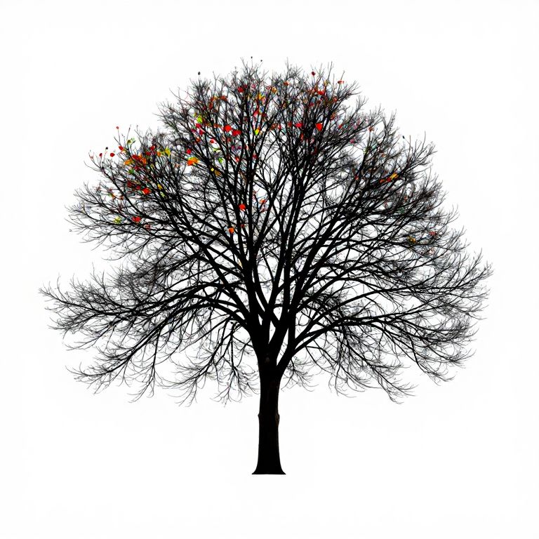 Minimalist digital art showcasing a single stylized tree on a white background, sharp contrast with bold black lines and subtle hints of vibrant color, emphasizing balance, space, and tranquility.
