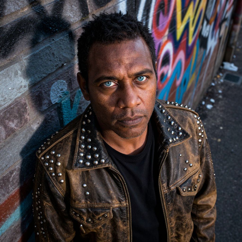 Craft a high-resolution digital portrait using DSLR photography, capturing an Aboriginal man with piercing blue eyes and a rugged jawline. He dons a worn leather jacket adorned with metal studs. Shoot from an aerial perspective to emphasize his intense gaze and the intricate details of his attire as he leans against a graffiti-covered brick wall in a dim alleyway. Natural light filters through, casting dramatic shadows on his face and illuminating the vibrant street art behind him. This evokes a sense of urban mystery while celebrating the man's individuality amidst defiance.