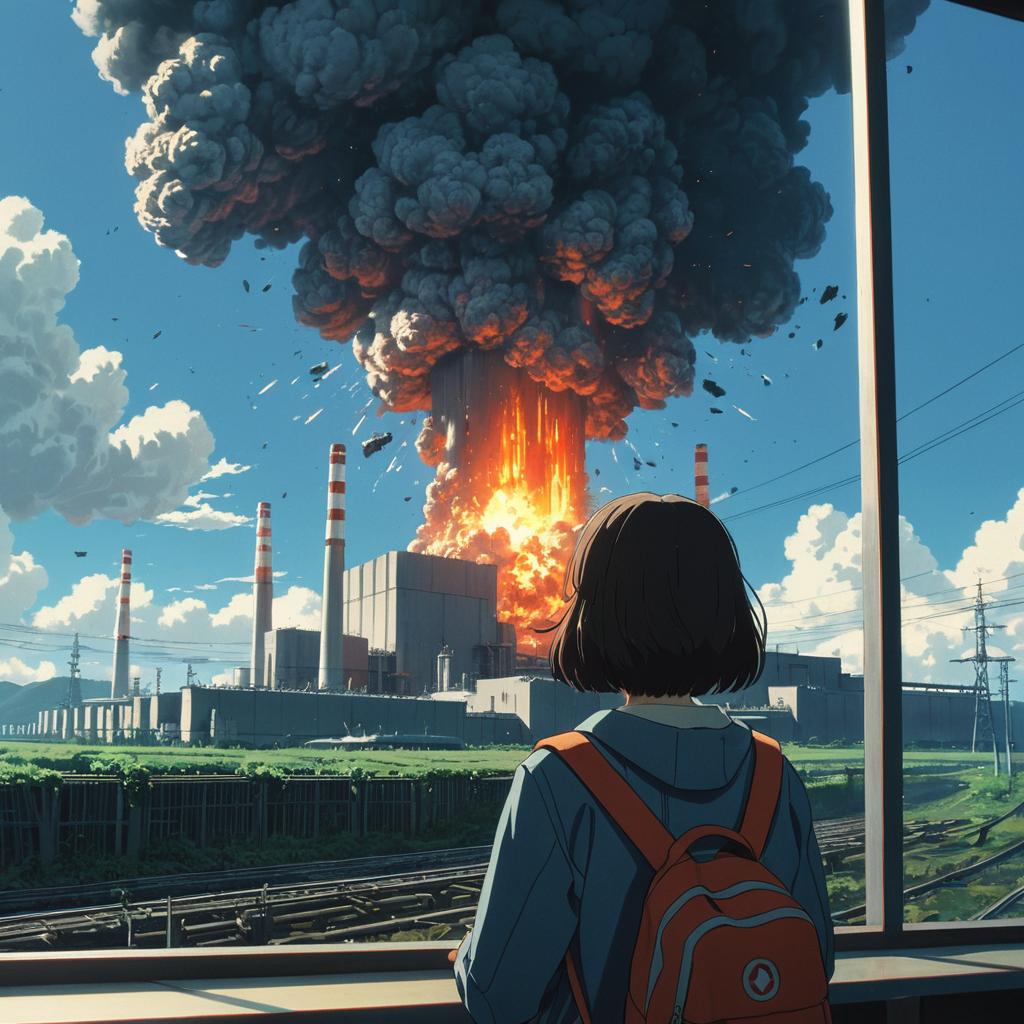 A highly detailed matte painting of a girl watching nuclear power station explosion by studio ghibli, makoto shinkai, by artgerm, by wlop, by greg rutkowski, volumetric lighting, octane render, 4 k resolution, trending on artstation, masterpiece