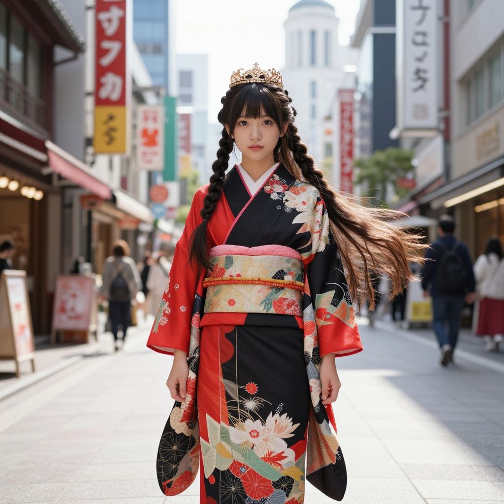 A beautiful young girl with long, flowing hair styled in intricate braids, wearing a traditional Japanese kimono featuring a vibrant red and black pattern. She wears a delicate, ornate crown on her head, adding a regal and mystical touch. She stands confidently on a bustling city street, surrounded by colorful storefronts and modern architecture, with a tall, elegant building in the background. The scene is bright and detailed, capturing a blend of cultural elegance and urban charm, with soft sunlight casting gentle shadows across the pavement.