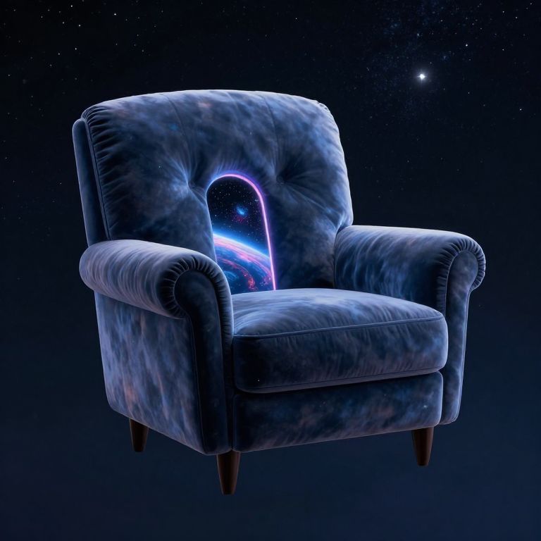 A surreal 3D-rendered armchair floats against a starry night sky, inviting dreamers into its plush cushions that reveal a glowing portal leading to infinite universes, blending fantasy with cosmic wonder in a high-definition, otherworldly visual effect.