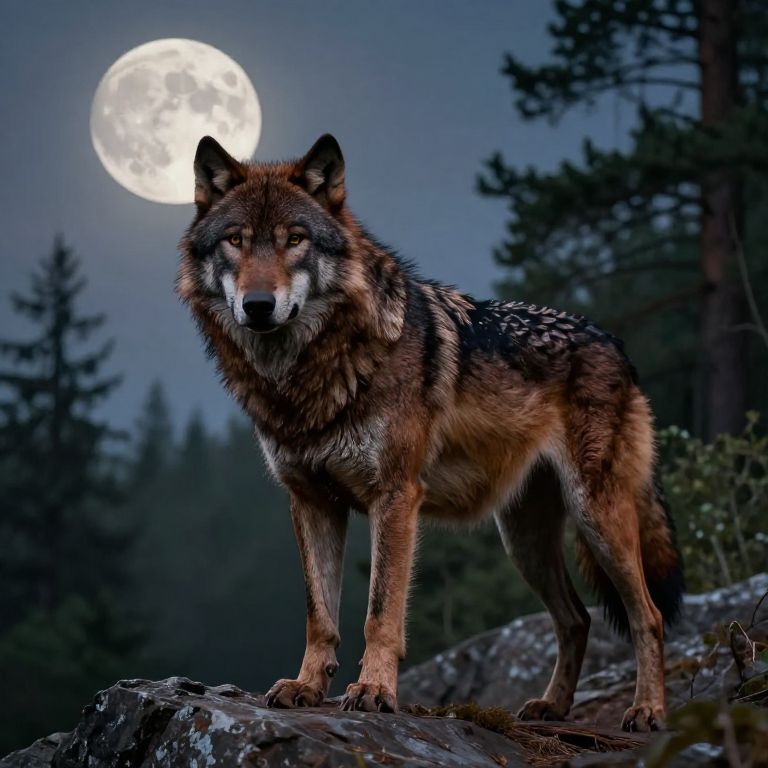 Photograph of a fierce, dark brown wolf with black and gray fur standing on a rocky ledge under a bright full moon, surrounded by dark pine trees