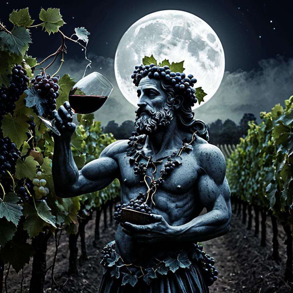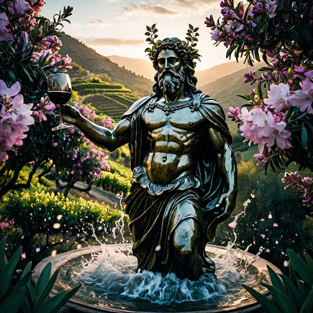 A detailed statue of Dionysus, the Greek god of wine, pleasure, and revelry, depicted holding a lyre and a glass of red wine, surrounded by figures celebrating. The statue is situated in a stone circular amphitheater with olive trees in the background, creating a classical ancient Mediterranean atmosphere.