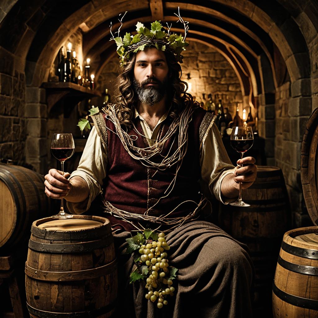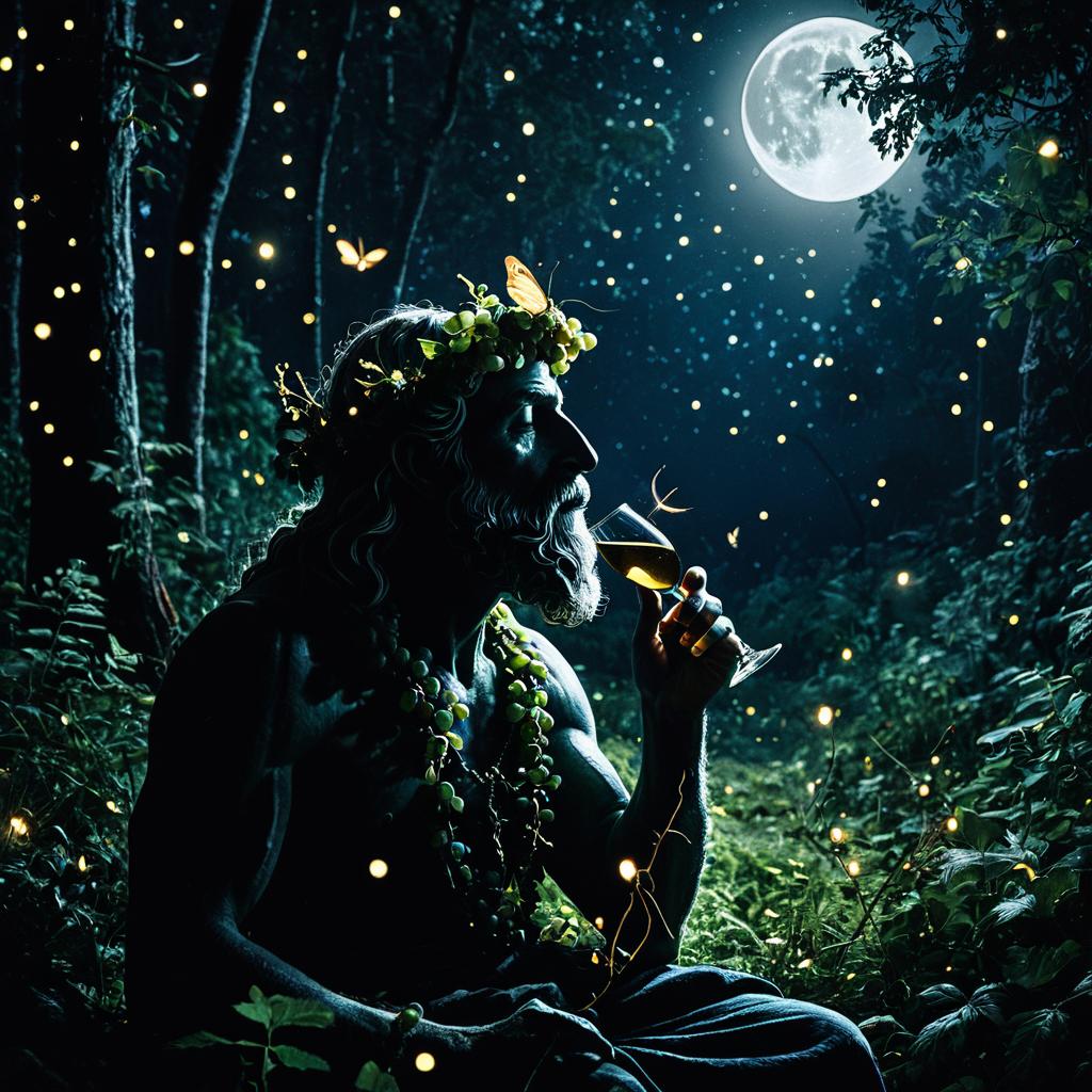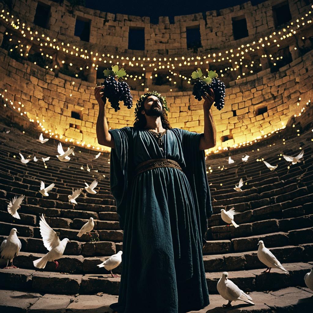 Dionysus – God of wine, pleasure, and revelry, portrayed as an exuberant deity playing a lyre surrounded by swirling wine fevers, set in an ancient amphitheater amid olive groves alive with revelry.