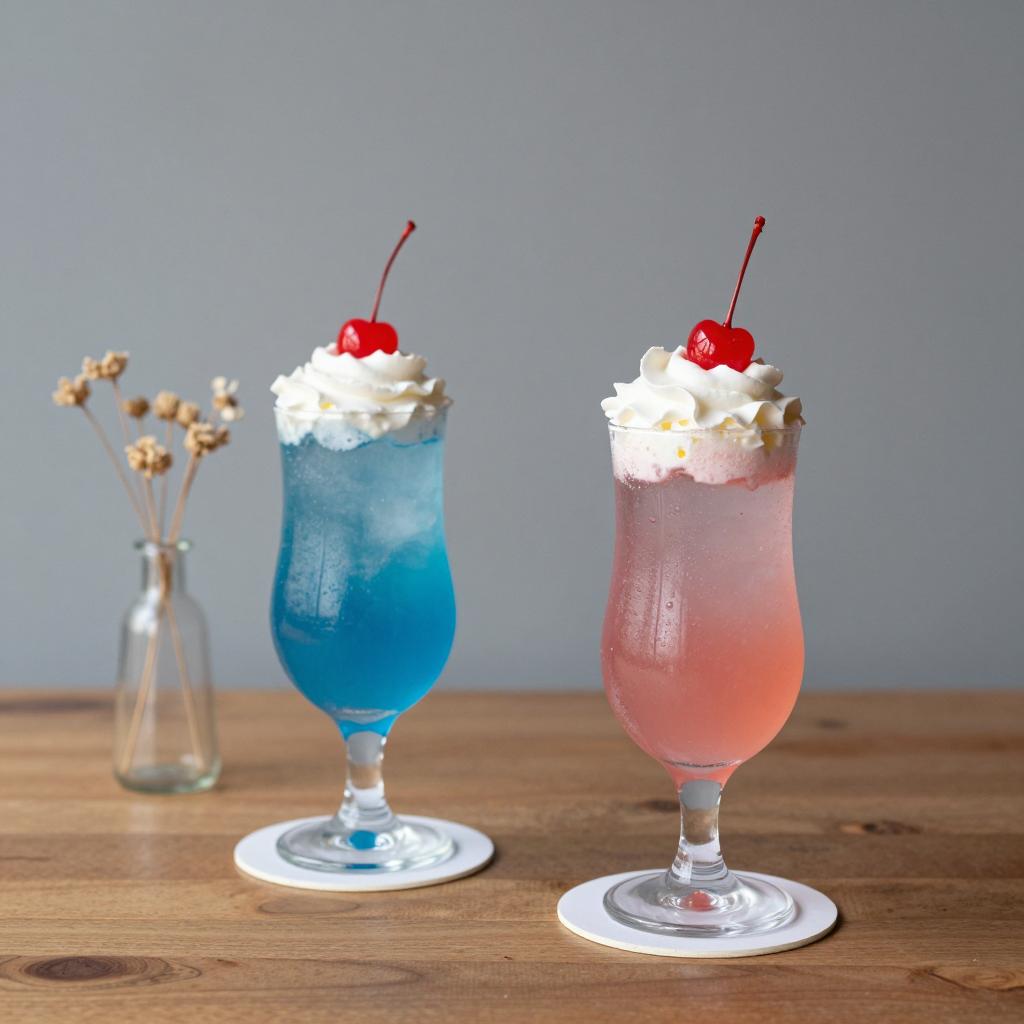 Two gradient blue and pink cocktails on clear goblet glasses, each with a cherry and whipped cream on top. Left glass has a smaller cherry, right glass has a larger cherry. Small vase with dried flowers on wooden table. Gray ured wall in background. White coasters under each glass.