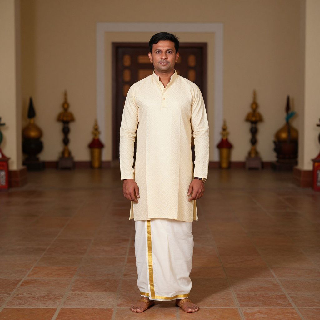 Traditional South Indian Man Clothing Costume, man in traditional indian attire standing in a large room