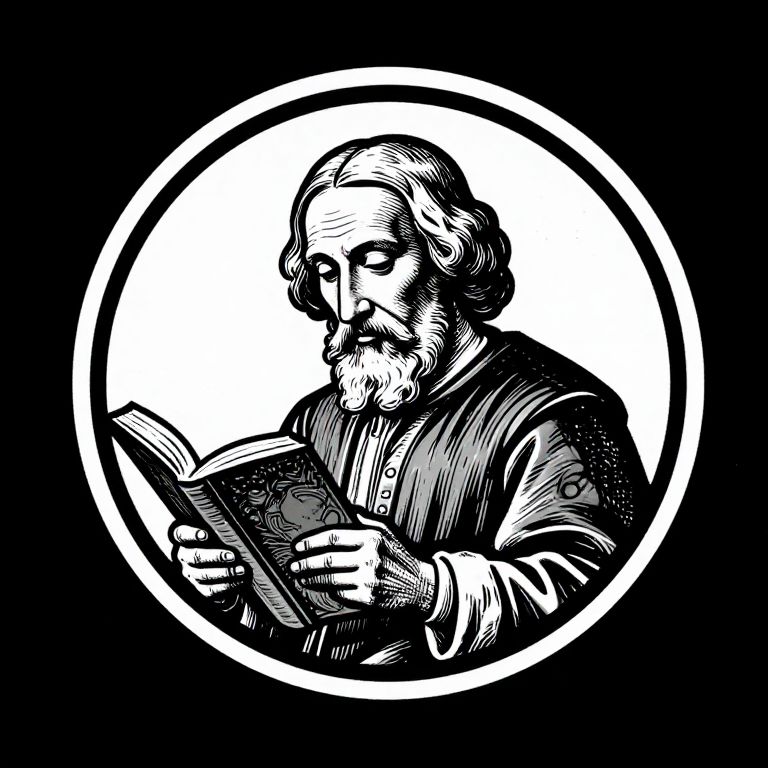 Monochrome ex-libris style badge depicting an early Renaissance writer reading a book. The illustration features detailed linocut-inspired linework with the writer dressed in period clothing, including a buttoned shirt and long-sleeved garment. The circular badge emphasizes a vintage artistic style reminiscent of the early Renaissance period.