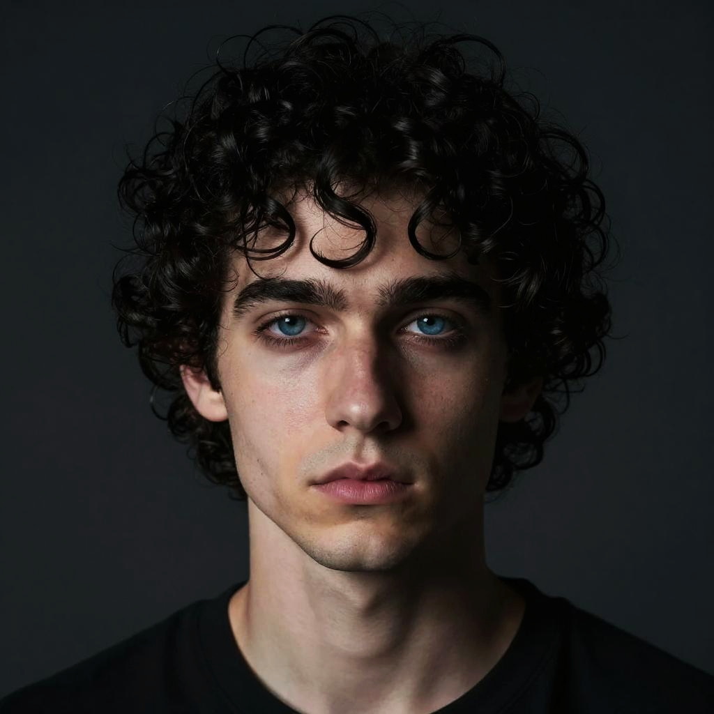 Curly black hair blue eyes male portrait, mysterious expression, dark moody background, high-resolution, cinematic lighting, intricate curls detail, studio photograph style