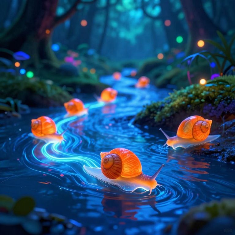 Bioluminescent snails with radiant orange shells and translucent bodies glide gracefully along a glowing blue stream in a fantastical forest, their luminous trails weaving through the enchanting, neon-lit landscape under the enchanting glow of ambient light effects.