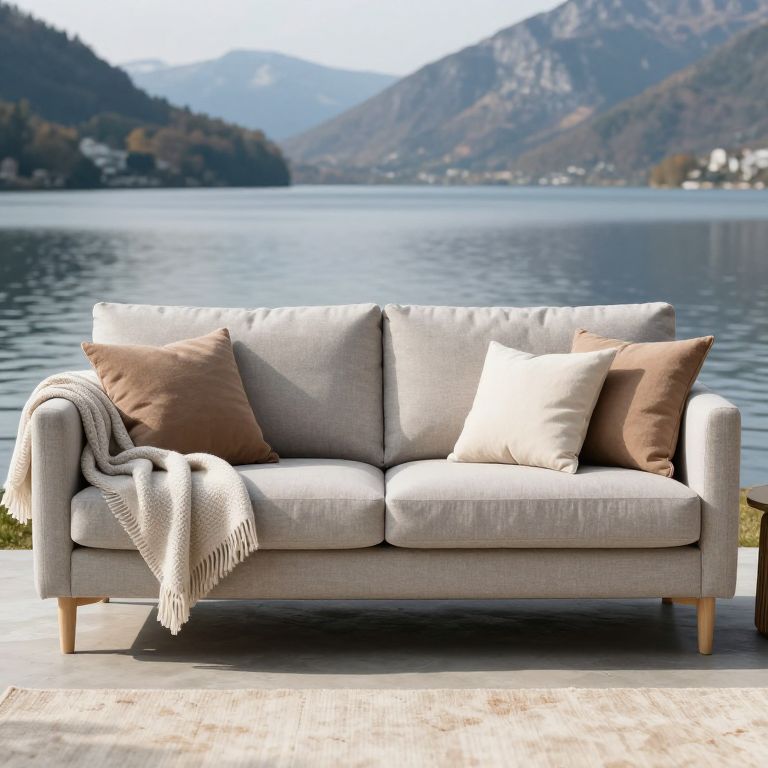 A cozy, Nordic-style sofa adorned with pillows and a blanket, set against a backdrop of a serene lake and mountains.