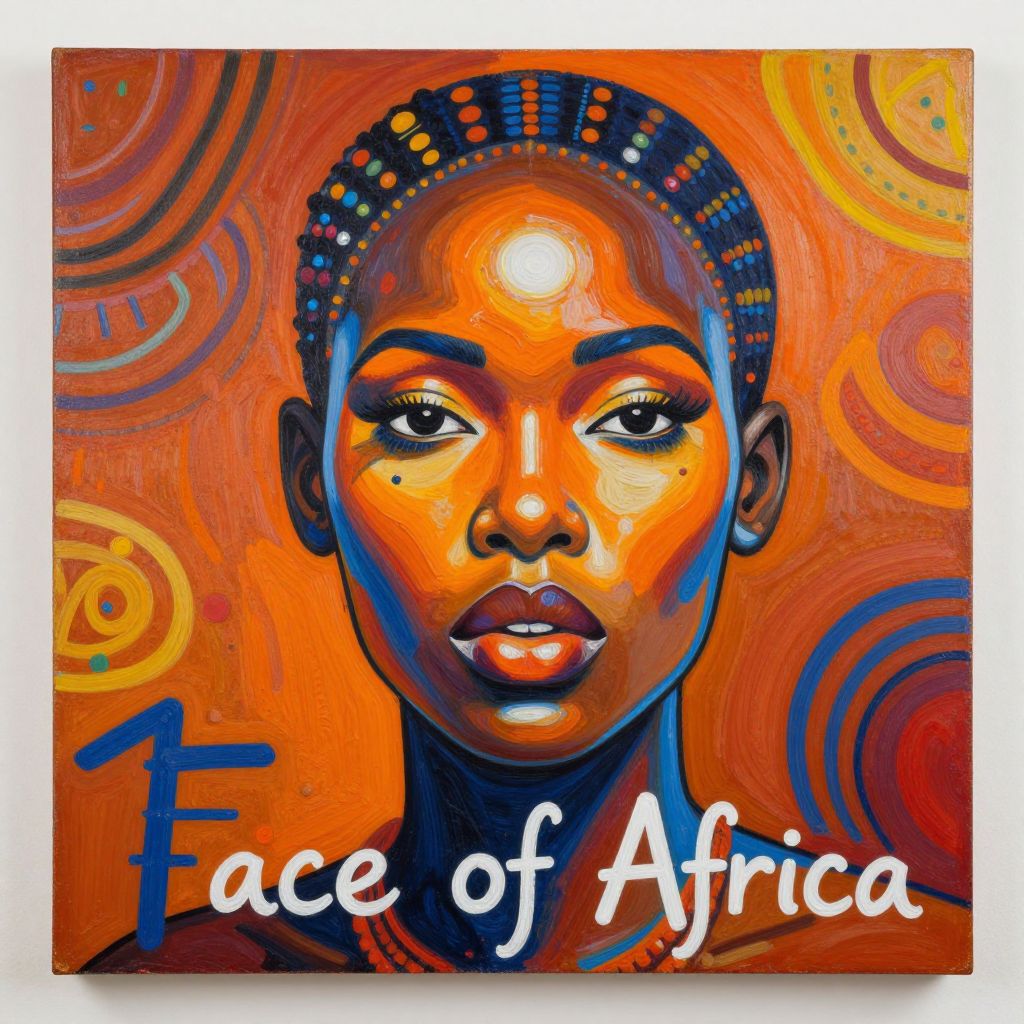 Vibrant digital painting of an African woman with braided hair, orange and red swirl background, bold colors, text "Face of Africa" in