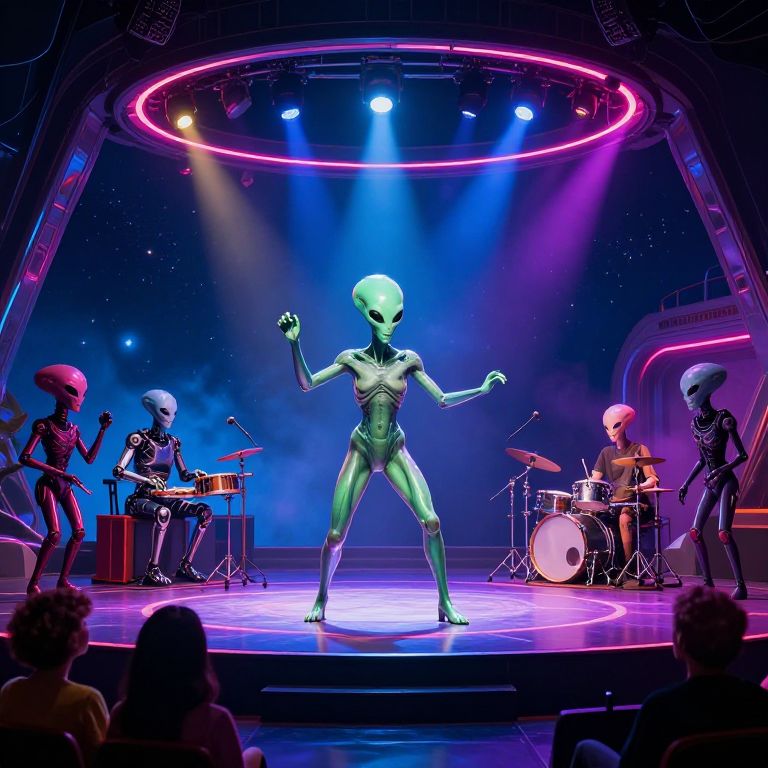 Alien the musical AI performing on a futuristic stage with glowing neon lights, surreal extraterrestrial audience, robotic instruments, vibrant colors, dynamic composition blending sci-fi with theatrical elements in a cosmic setting