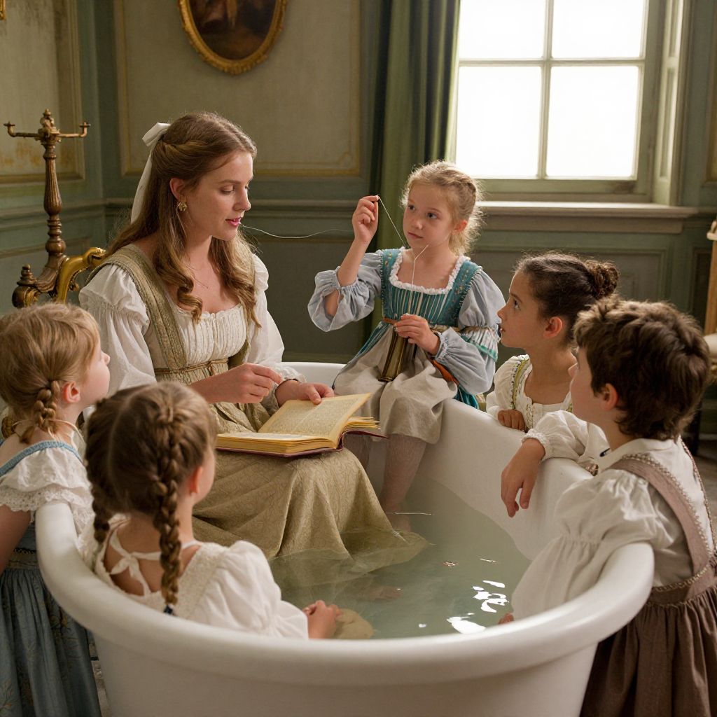 In a Georgian-era parlor bathed in soft afternoon light, a young woman weaves stories of wonder into the hearts of attentive children, her voice a gentle thread binding the transient moments of childhood to the timeless tapestry of imagination.