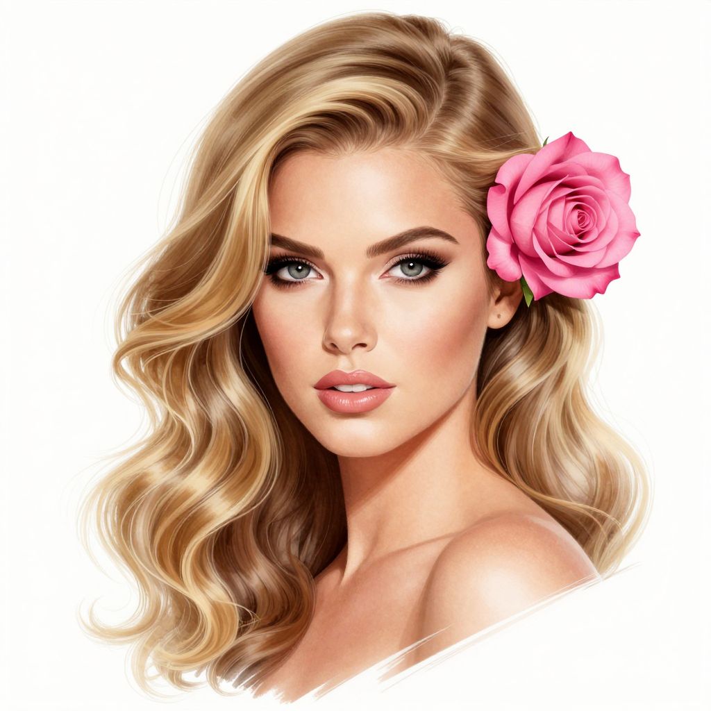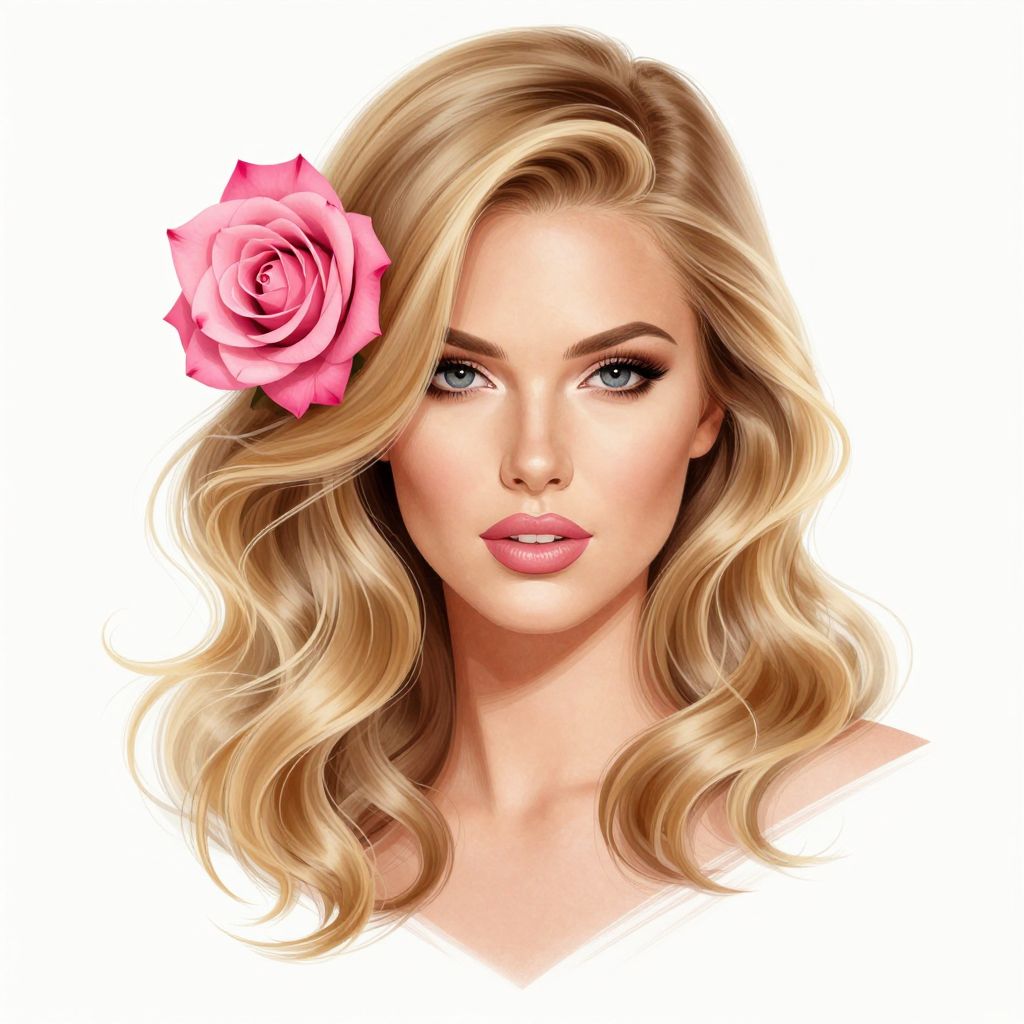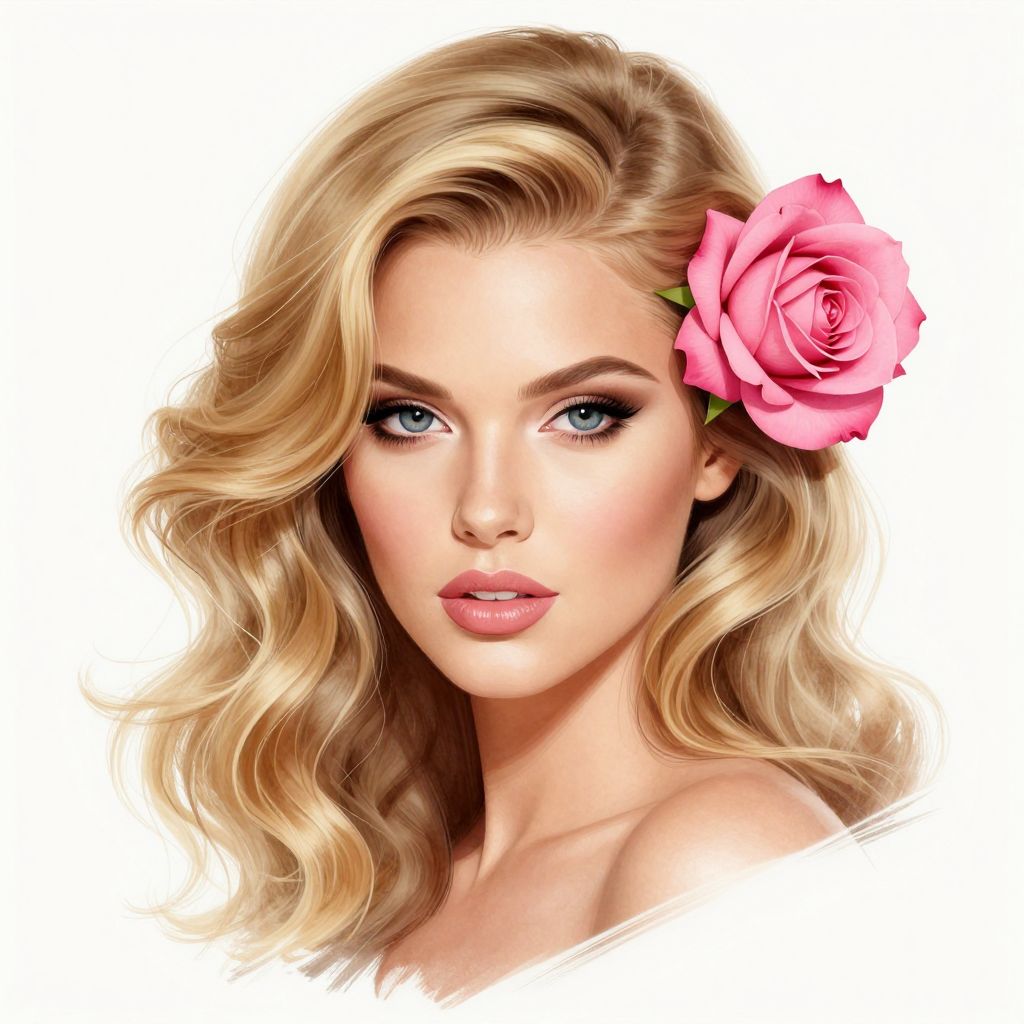 Digital illustration of a blonde woman with wavy hair, blue eyes, pink rose in her hair, and subtle makeup, against a white background.