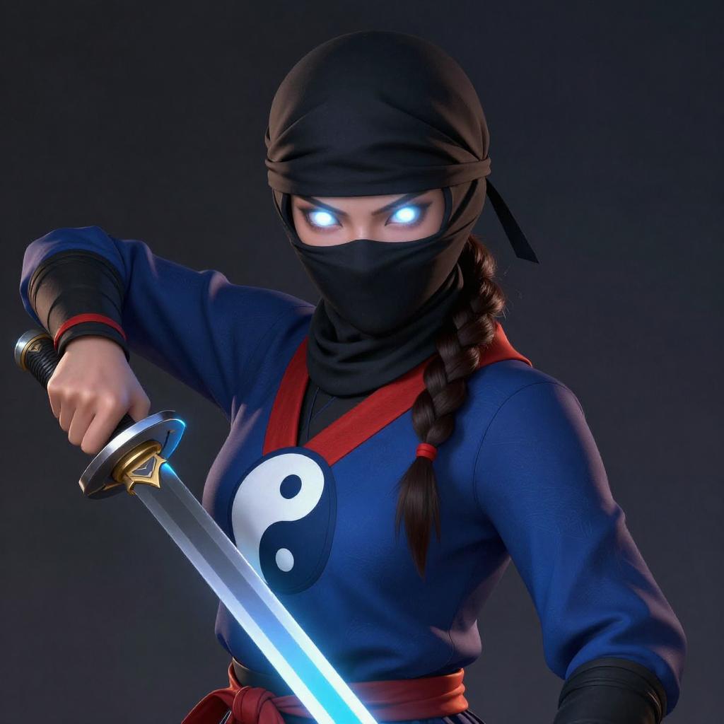 Digital artwork of a ninja with glowing white eyes, wearing a black mask, blue and red outfit, and a yin-yang symbol on the chest. She holds a glowing blue sword, with a braid over her shoulder and dark background. Her expression is focused and intense.