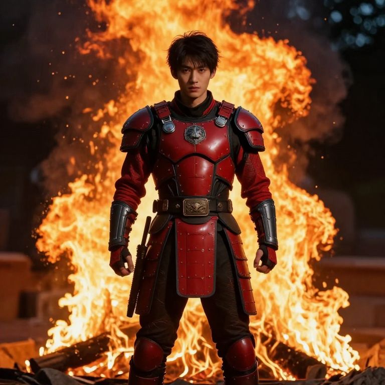 Fire, boy in red and black armor standing in front of a fire