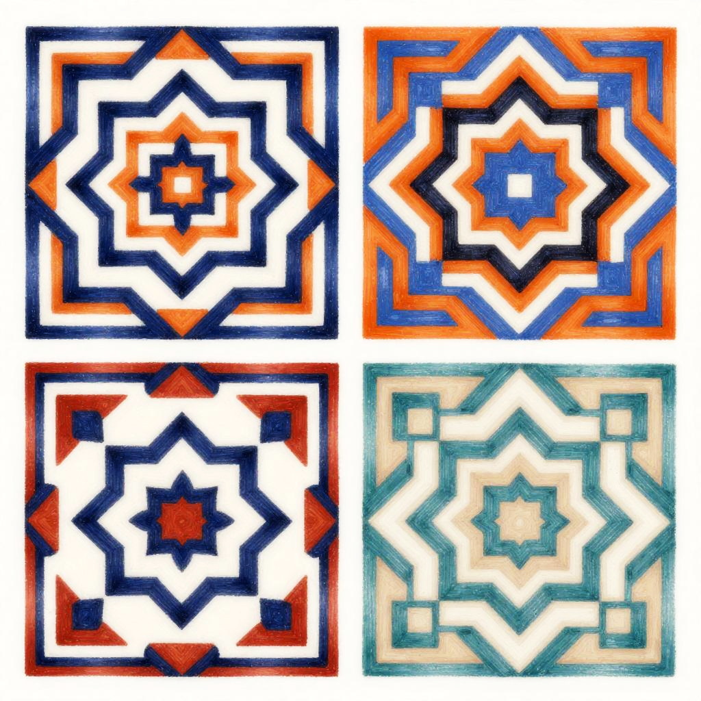 This image is a vibrant digital drawing featuring four intricate, geometric, mosaic-like patterns. Each pattern is a different shape and color scheme, with dominant hues of blue, orange, and white. The top left is dark blue with white and orange accents, the top right is orange with blue and black, the bottom left is white with red and blue, and the bottom right is teal with beige and white. The patterns overlap slightly, creating a rich, textured visual effect.