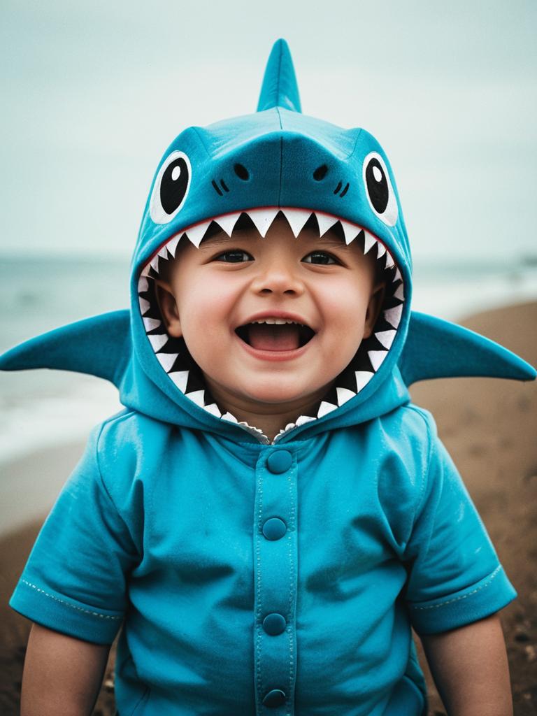 Man in Baby Shark face costume, cosplay editorial portrait, photorealistic tones