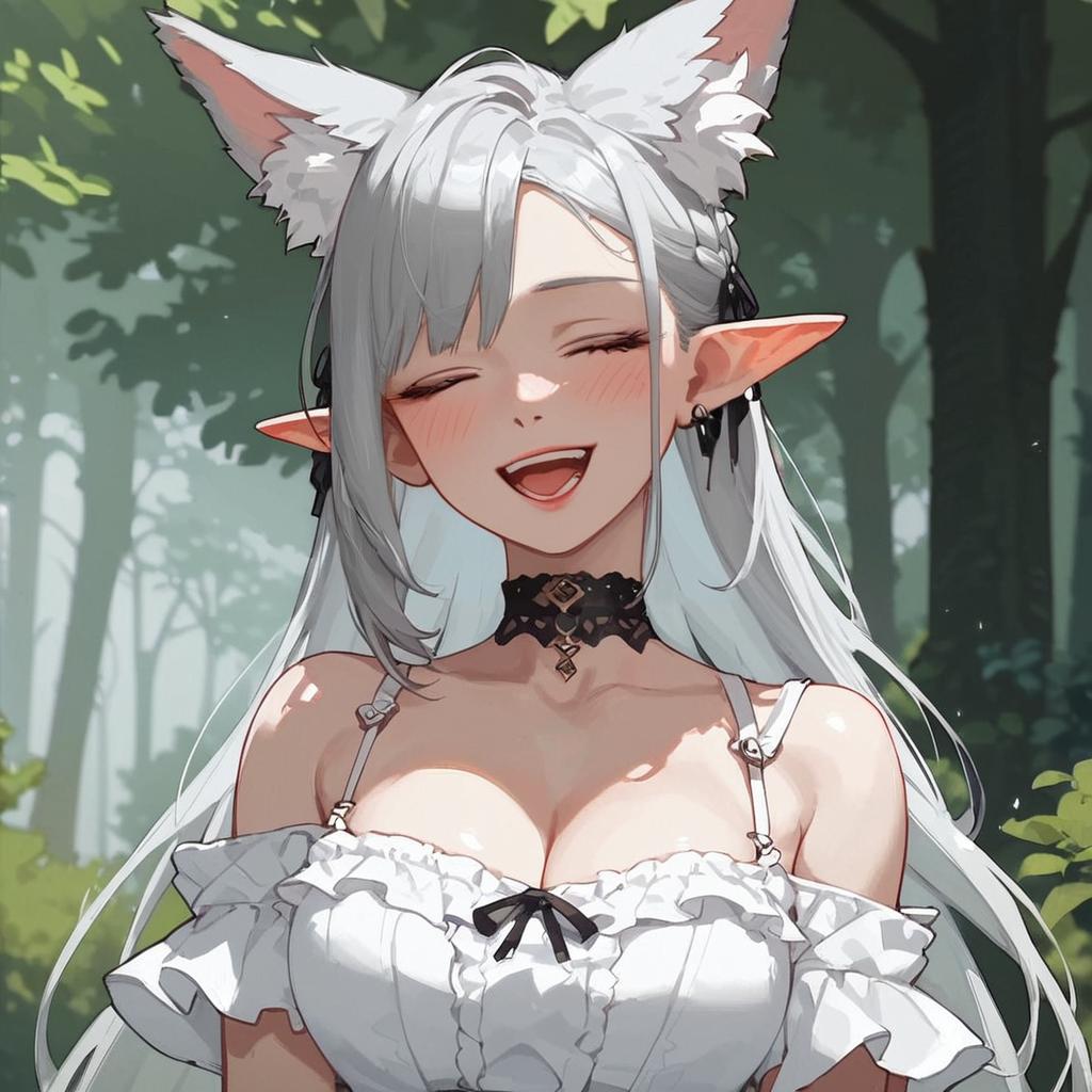 Score_4, score_5, score_6, score_9, score_8_up, score_7_up, source_anime, FenrysLv2, 1girl, openmouth, smile, nose blush, teeth, grey hair, very long hair, closed eyes, wolf ears, (ears down:1.2), pointy ears, choker, white dress, bare shoulders, black ribbon, cleavage, strap slip, looking at viewer, standing, portrait, outdoors, forest, fine anime screencap_xl, anime_screencap